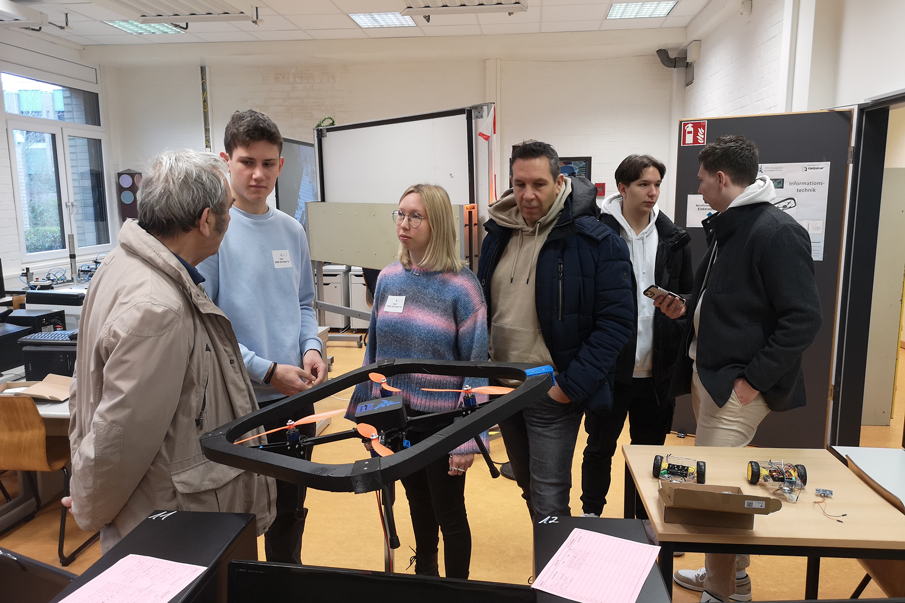 Jolina (auch aus der Technik) wird von Schülern und ihren Eltern mit Fragen gelöchert und erklärt geduldig, wie der Weg zum Abitur im BG aussieht – die Zuhörenden sind begeistert, eine Mutter erklärt: "Schade – für mich wäre die Technik absolut erste Wahl gewesen, aber meine Kinder möchten in das BG Wirtschaft – auch gut."