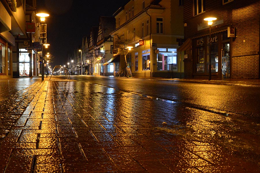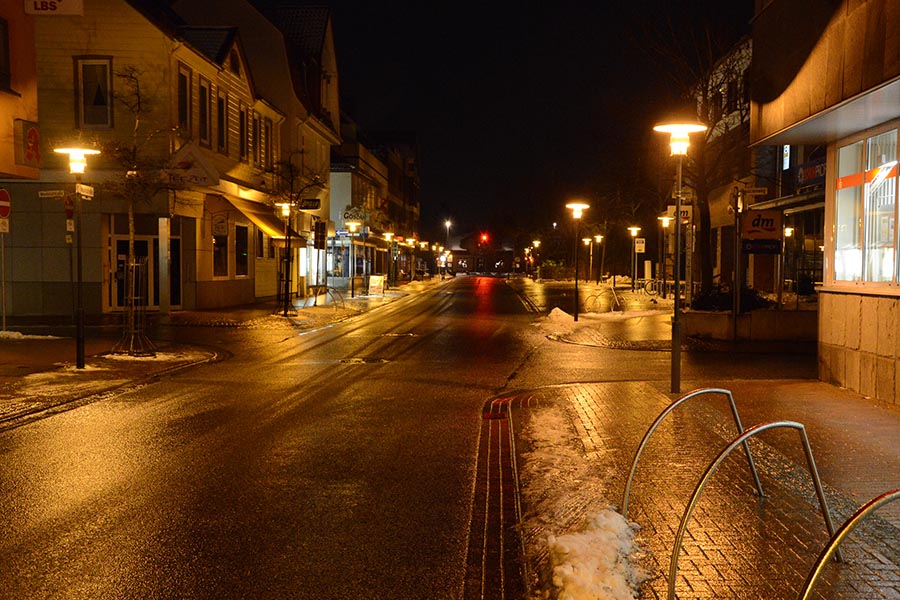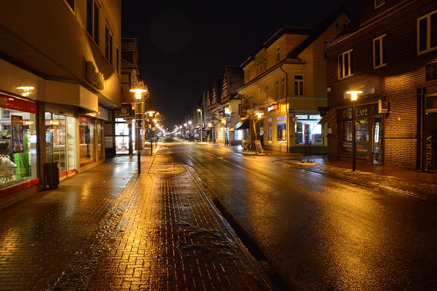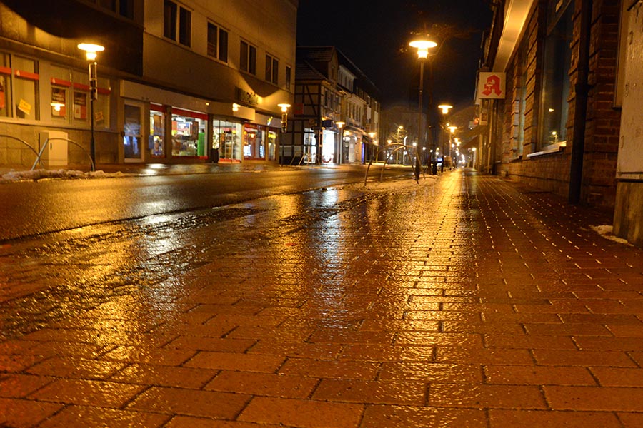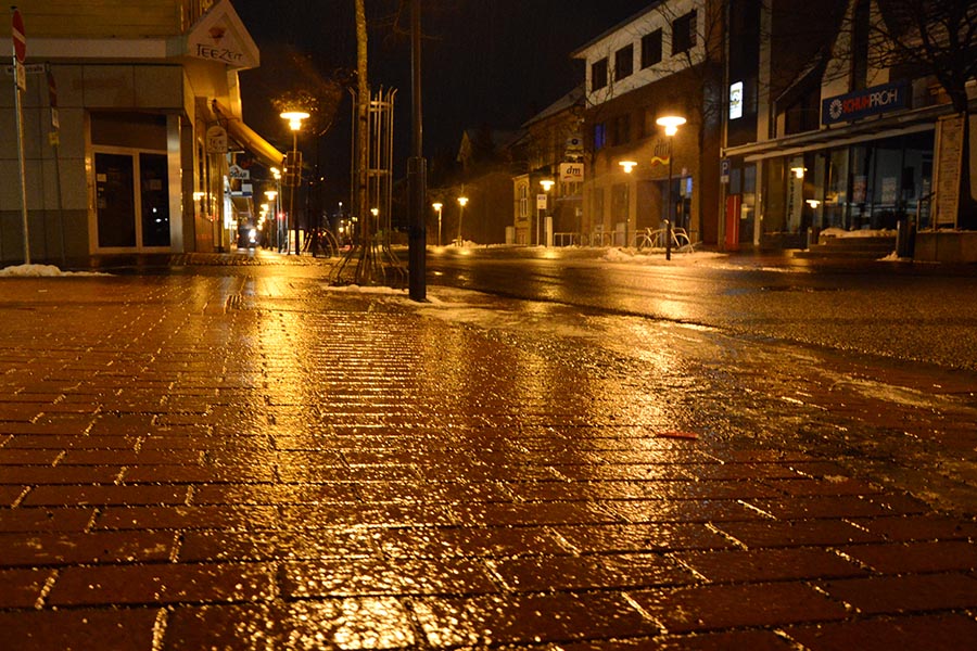 Es tröpfelt nur ein wenig, aber das ruhige Wetter täuscht: Denn jeder Tropen, der derzeit den Boden erreicht, friert innerhalb kurzer Zeit zu Eis. So ist die Burgdorfer Innenstadt (unser Foto) derzeit von einer Einsschicht überzogen. Die Fußwege sind mit ihrem von Haus her schon etwas glatterem Verbundpflaster besonders rutschig, auf den Straßen sieht es etwas besser aus. Der rauhe Asphalt ist noch nicht gänzlich mit Eis überdeckt. Trotzdem wirkt die Burgdorfer Innenstadt – wie wohl die gesamte Region – derzeit fast wie ausgestorben. Nur ganz vereinzelt sind noch Autofahrer oder Fußgänger unterwegs. Was auch besser ist: Wie wir nur für die Aufnahme der – zugegebenermaßen doch stimmungsvollen – Bilder feststellen mussten, sind alleine schon die ersten Meter aus dem Haus heraus eine wahre Herausforderung, Schlittschuhe könnten bei diesen Verhältnissen fast das bessere Fortbewegungsmittel sein…