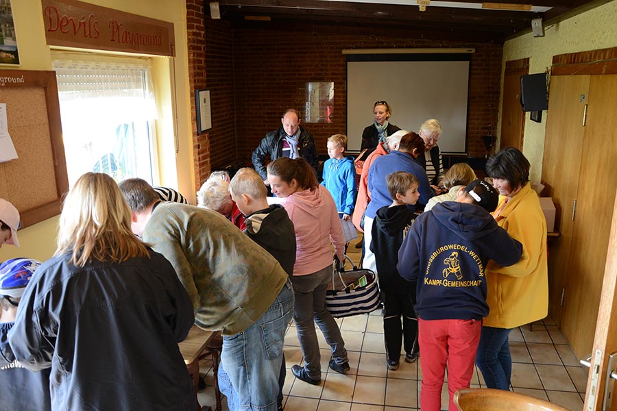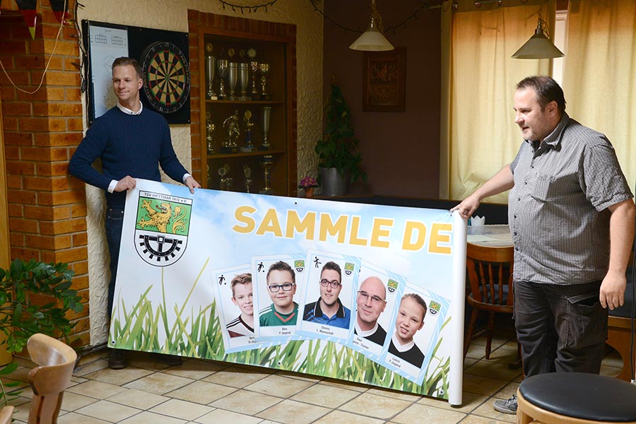 Aber nicht nur die Aktion selbst, bei der 358 verschiedene Bilder des TSV gesammelt werden mussten, löste Begeisterung im Ort aus, auch die Transparente, die die Aktion ankündigten, wurden in die Sammelleidenschaft aufgenommen. So wurden heute, bei der zweiten und letzten Tauschbörse, 3 große Werbebanner sowie 5 kleinere im TSV-Vereinshaus durch Markus Geng, Vorsitzender der Tischtennissparte, versteigert. Spannend lieferten sich hierbei die Judo-Abteilung und die Tischtennisabteilung ein intensives Steigern um das erste Plakat, das am Ende für 160 Euro von der Tischtennisabteilung ersteigert wurde und nun die TSV-Halle zieren soll. Die Judoka bekamen beim zweiten Transparent den Zuschlag und die Fußballer beim Dritten. Am Ende kamen so heute 400 Euro zusammen, aus dem Bratwurstverkauf bei der Auftaktveranstaltung wie auch beim heutigen Abschluss kamen weitere 270 Euro hinzu, so dass am Ende 670 Euro zu Buche standen, die nach der Versteigerung an Ellen Flis, Leiterin der Kindertagesstätte in Wettmar, offiziell überreicht wurden. "Wir haben noch einiges im Außenbereich des Kindergartens vor, da hilft uns die Spende sehr", so die Kita-Leiterin. So könnte beispielsweise eine zweite 6er-Bank damit angeschafft werden. "Sie erfreuen damit 150 Kinderherzen", erklärte sie den Anwesenden und lud diese anschließend zur Einweihung der neuen Geräte in die Kita ein.