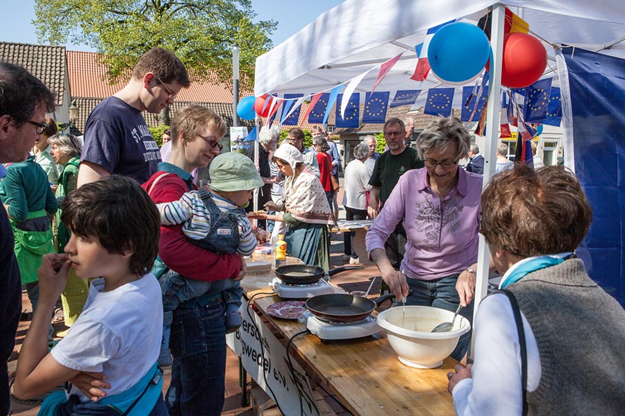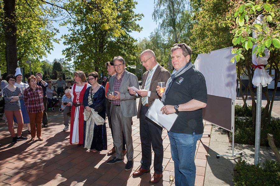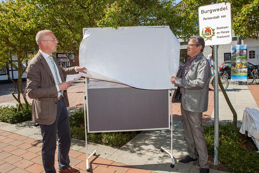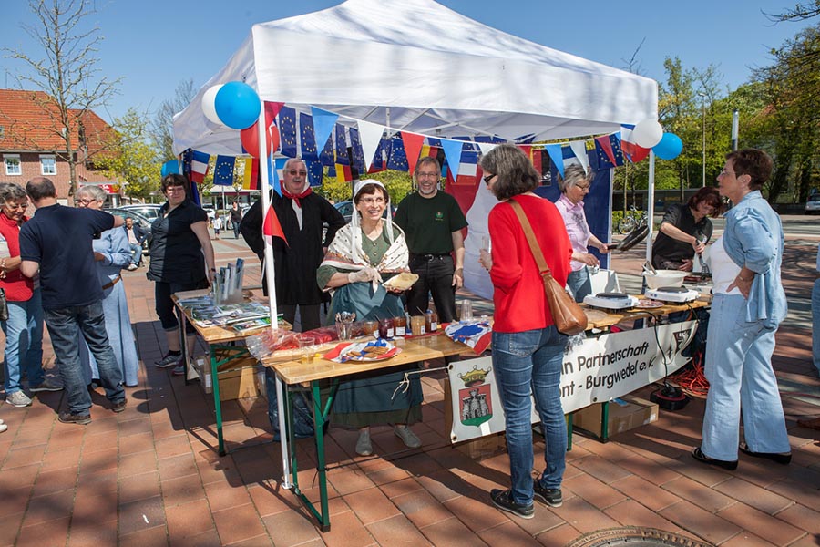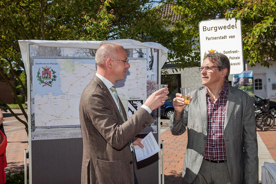 20 Jahre besteht nun schon die Partnerschaft zwischen Burgwedel und der französischen Stadt Domfront-en-Poiraire. Am vergangenen Wochenende besuchte daher eine Delegation um die stellvertretenden Bürgermsieter Aurélie Leroux und Marcel Folliot die Stadt Burgwedel, um den runden Geburtstag zu feiern und die Städtepartnerschaft weiter zu festigen. Die Partnerschaftsvereine um Marie Laura Prod´homme und Andreas Listing präsentierten sich auf dem Domfront-Platz und zu Ehren des Jubiläums wurden die neuen Schilder, die an den Ortseingängen auf die Partnerschaft hinweisen, erneuert. Denn nach einer Gebietsreform wurde aus Domfront nun Domfront-en-Poiraire.