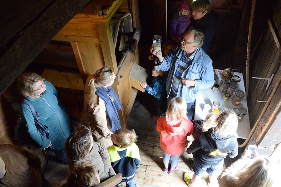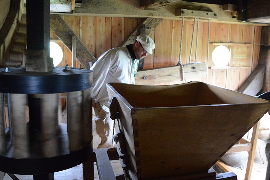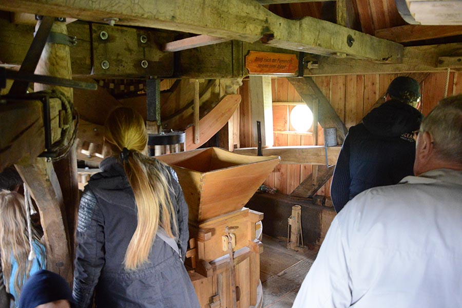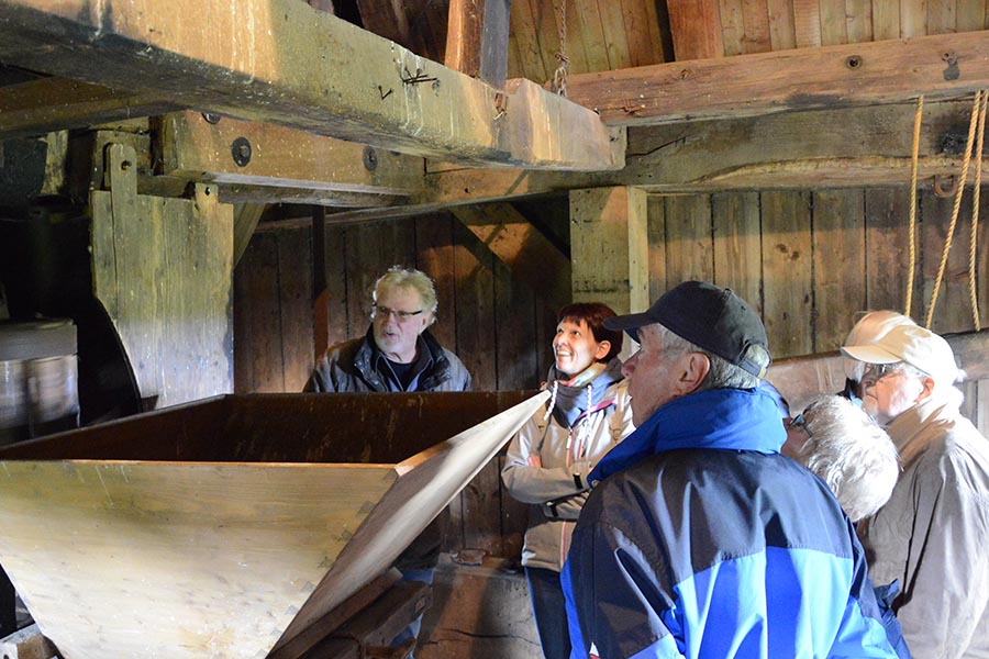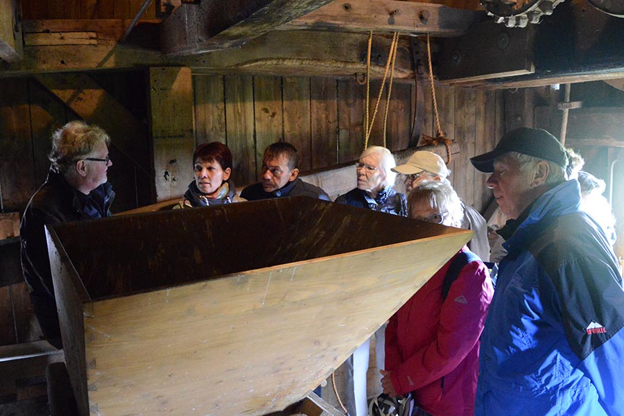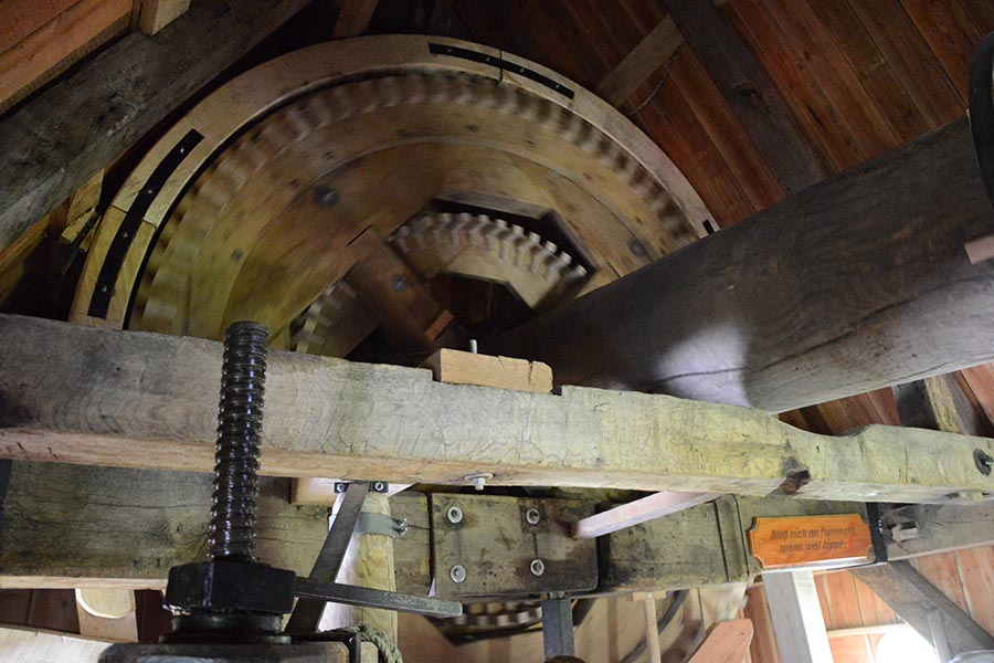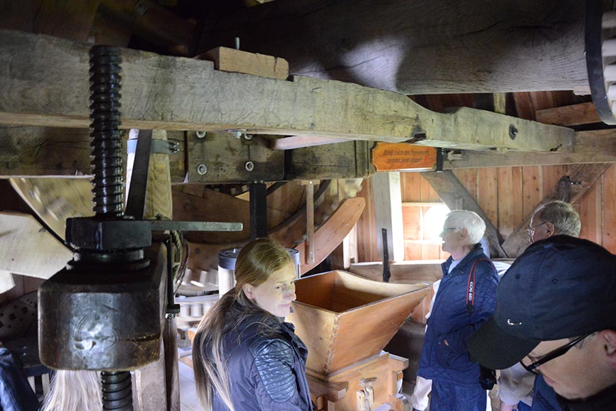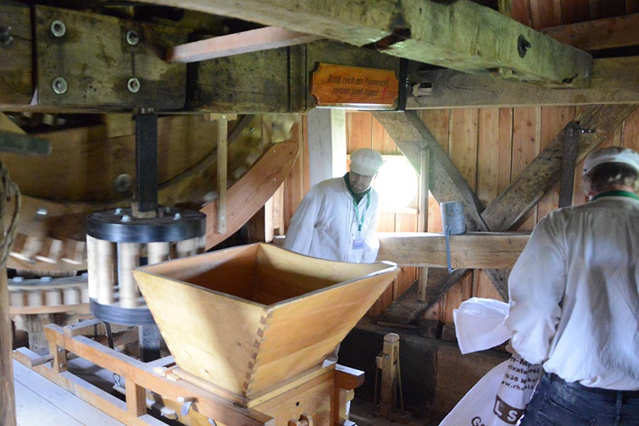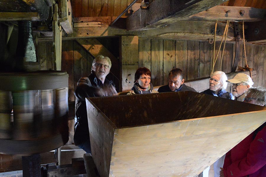 Der Wind brachte die zwei Segelflügel wie auch die zwei Jalousieflügel der im Jahre 1585 erbauten Bockwindmühle in Bewegung, so dass dem Publikum das Mahlen von Dinkel vor Ort vorgeführt und erklärt werden konnte. Dazu waren die Zuschauer in der Mühle zunächst auf dem Mehlboden und im zweiten Teil der Führung auf dem Steinboden der Mühle willkommen. Begriffe wie Hausbaum, Ritzel, Kammrad und Stert wurden gerne erklärt und auch der Laie konnte den Aufbau wie auch die Funktionsweise der Mühle verstehen und nachvollziehen.