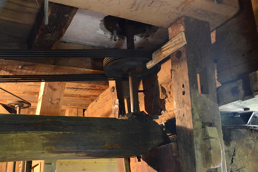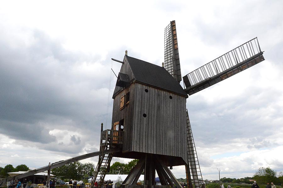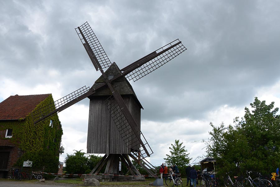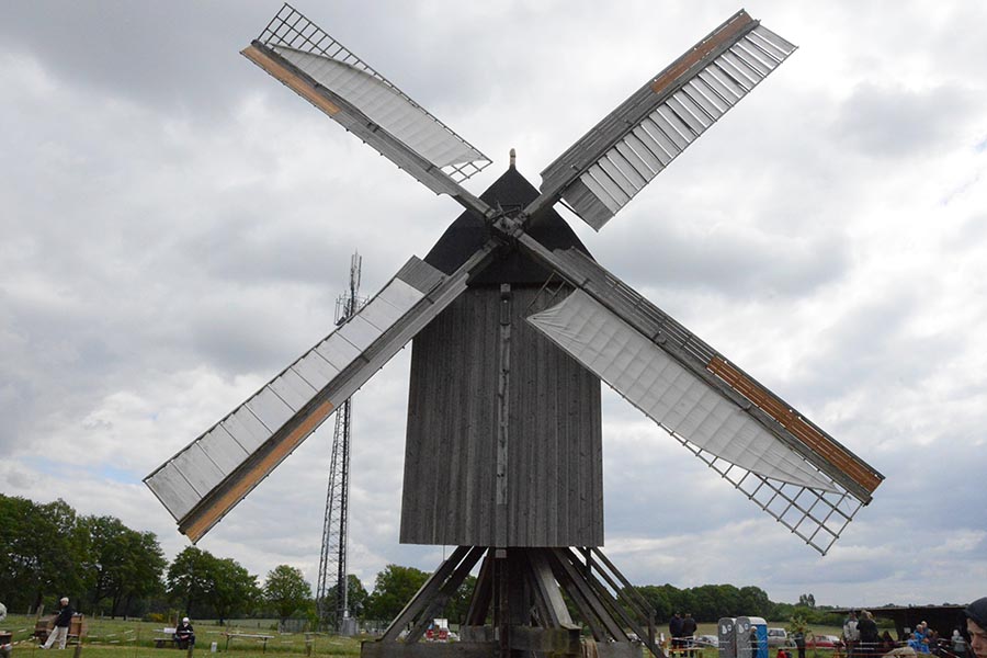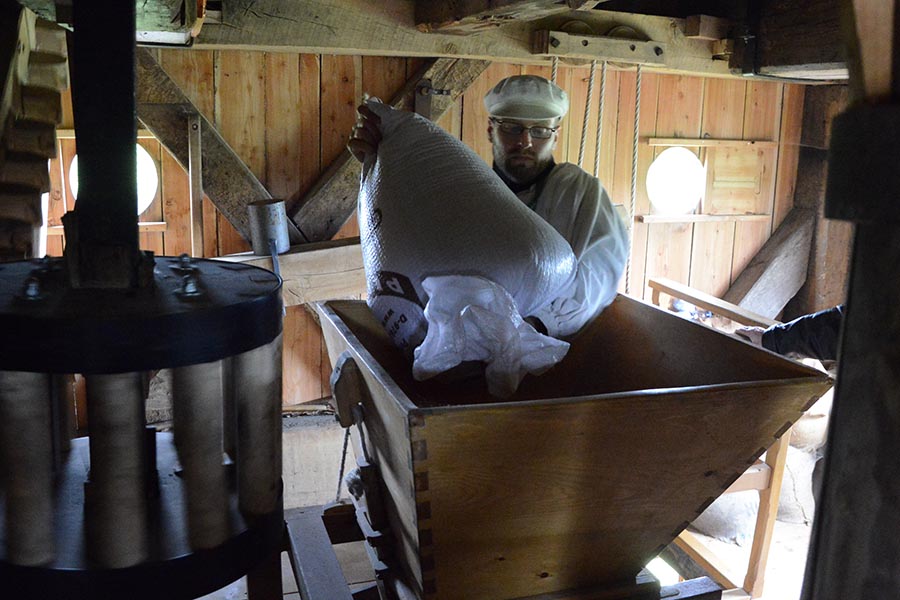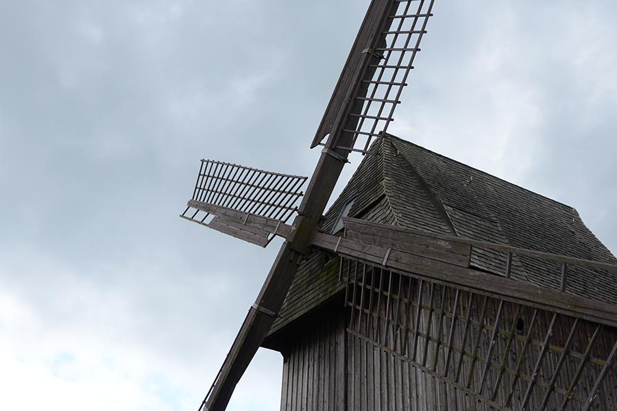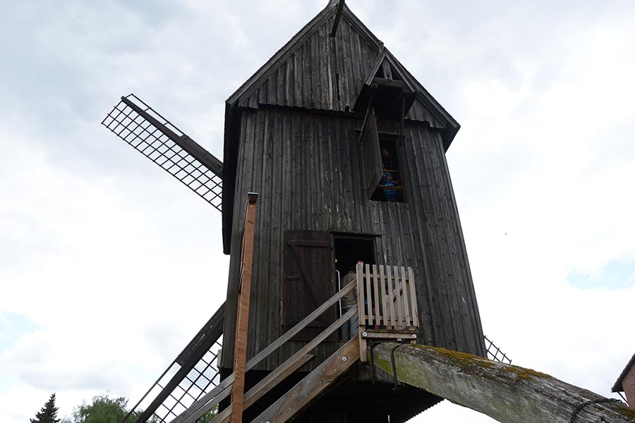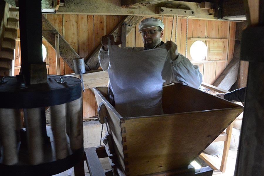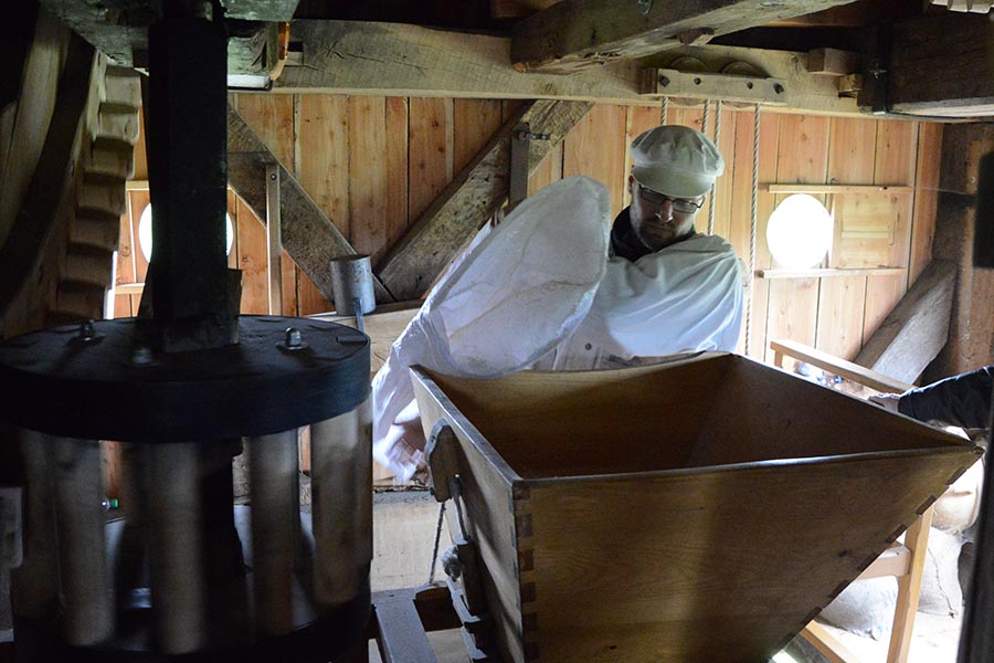 Der Wind brachte die zwei Segelflügel wie auch die zwei Jalousieflügel der im Jahre 1585 erbauten Bockwindmühle in Bewegung, so dass dem Publikum das Mahlen von Dinkel vor Ort vorgeführt und erklärt werden konnte. Dazu waren die Zuschauer in der Mühle zunächst auf dem Mehlboden und im zweiten Teil der Führung auf dem Steinboden der Mühle willkommen. Begriffe wie Hausbaum, Ritzel, Kammrad und Stert wurden gerne erklärt und auch der Laie konnte den Aufbau wie auch die Funktionsweise der Mühle verstehen und nachvollziehen.