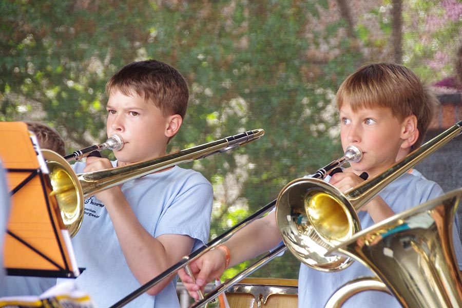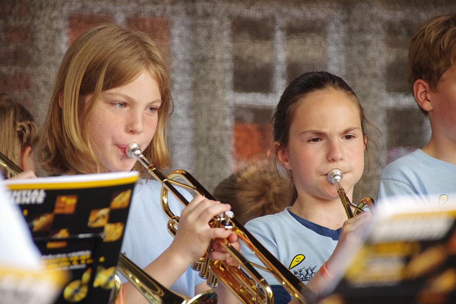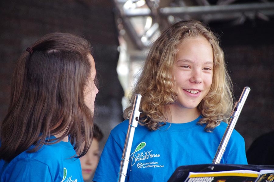 Zum ersten Mal dabei: die beiden Bläserklassen des Gymnasiums Großburgwedel, nämlich die "Crazy Horns" (Klasse 5B) und die "Music Kids" (Klasse 6B) mit ihren beiden Musik- und Klassenlehrern Martin Pape und Johannes Grüne. Nach gemeinsamer Anfahrt mit dem Bus stand gleich um 10.30 Uhr schon der erste Auftritt auf der Bühne sechs am Verdener Dom an. Zum ersten Mal "Open Air" aufzutreten war für alle Beteiligten äußerst aufregend, doch mithilfe des mitgereisten Burgwedeler "Fanclubs" und freundlicher Mitschüler aus anderen, zuvor völlig fremden Bläserklassen stellte sich schnell richtig Spaß ein. Von Beethovens "Ode an die Freude" bis zu den "Pirates Of The Caribbean", von "Oh When The Saints Go Marching In" bis zu "Alles nur geklaut" – beide Bläserklassen zeigten die ganze Bandbreite ihres Könnens und gingen nach einer knappen Stunde mit verdientem Applaus von der Bühne.
