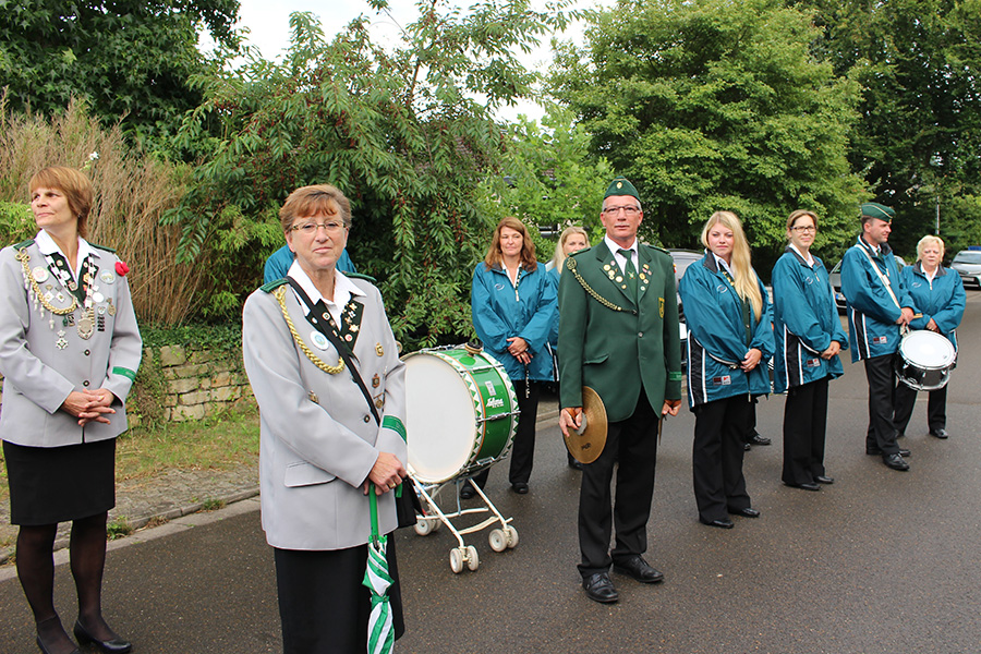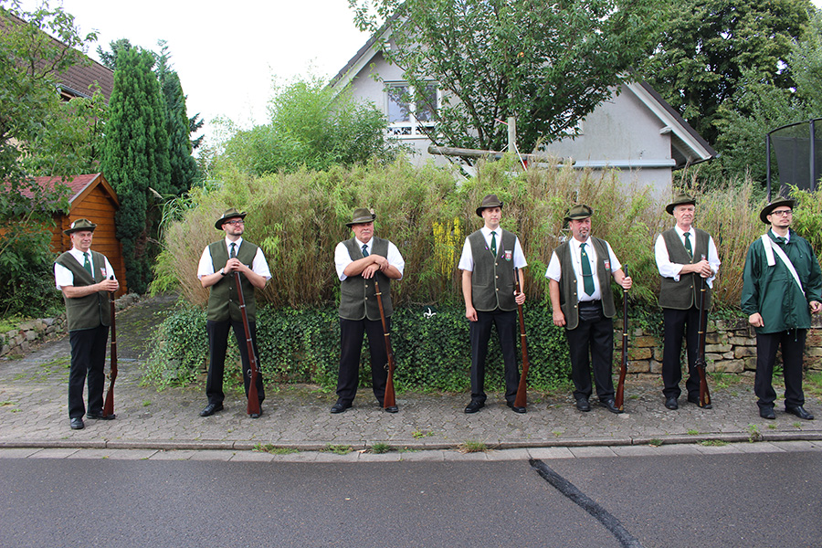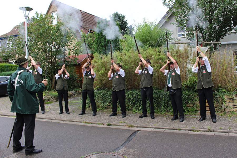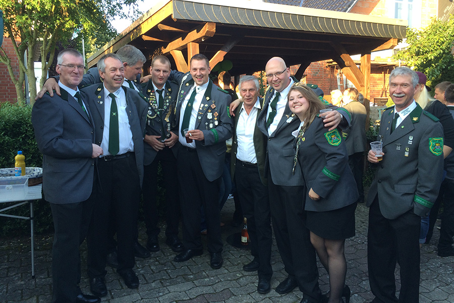 Rund 100 Gäste konnte der Wettmarer König begrüßen. Neben seiner Familie, Freunden, und Bekannten und der Abordnung des Schützenvereins "Gut Ziel" Wettmar mit seinem 1. Vorsitzenden Andreas Genske waren auch die Mitglieder des Schützenvereins (SV) Kleinburgwedel unter der Leitung des Vorsitzenden Volker Speckmann angetreten, um das Scheibenaufhängen feierlich zu begleiten.