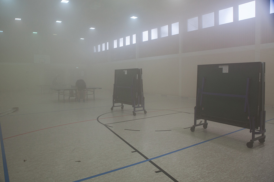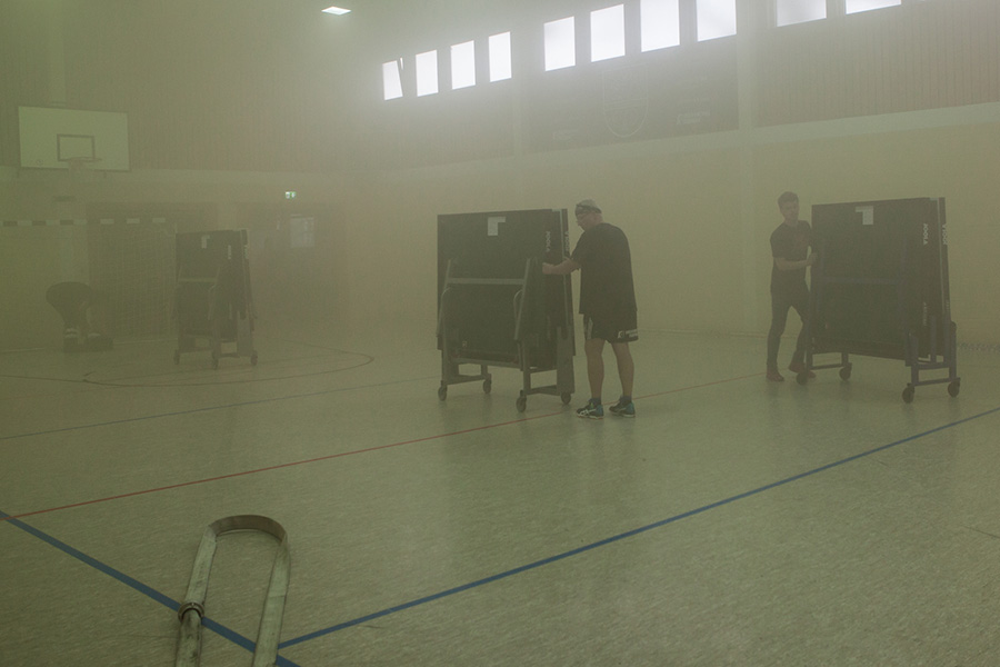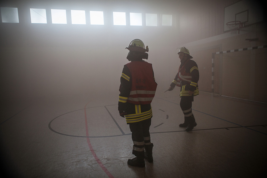 Unter Atemschutz gingen 2 Trupps in die durch Kunstrauch vernebelte Sporthalle und suchten die Vermissten. Um das Gebäude herum wurde die Wassserversorgung aufgebaut. Einerseits hieß es hierbei natürlich, das Feuer zu bekämpfen, aber auch Nebengebäude zu sichern. So wurde die Ortswehr Thönse mit der Aufgabe betraut, das Nachbargebäude durch eine Riegelstellung zu sichern und ein Übergreifen der Flammen zu verhindern. Die beiden anderen Ortswehren machten sich an die direkte Brandbekämpfung, so dass das fiktive Feuer aus insgesamt 9 C-Schläuchen bekämpft werden konnte.