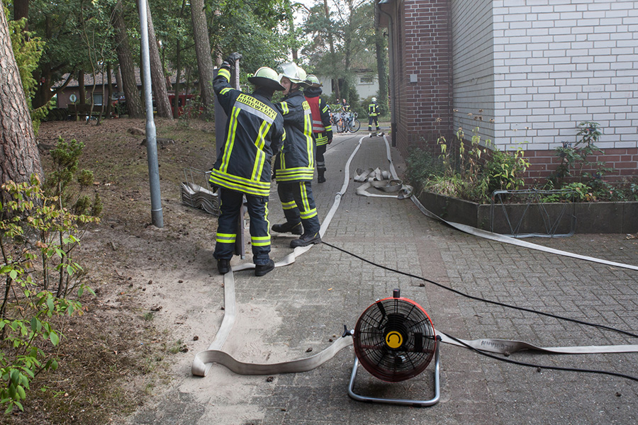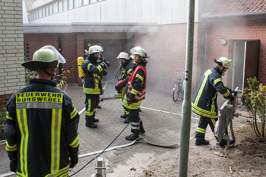 Großaufgebot der Feuerwehren am Freitagabend im Burgwedeler Ortsteil Engensen: Aus der Sporthalle an der Waldstraße solle Rauch zu sehen sein, war in der Einsatzmeldung zu sehen, die an die Freiwilligen Feuerwehren Engensen, Thönse und Wettmar ging. Zudem wurden die Einsatzkräfte darüber informiert, dass sich vermutlich noch Personen im Gebäude aufhalten würden. Rund 50 Einsatzkräfte mit 6 Fahrzeugen eilten zum Brandort, der allerdings eine Übung durch Engensens Ortsbrandmeister Uwe Balke war.