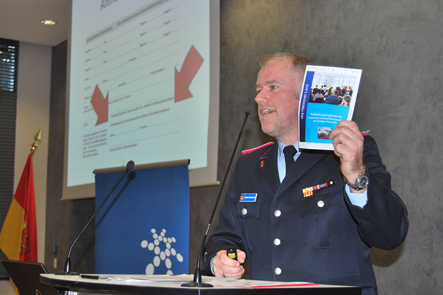 Mit einem Fortbildungsprogramm für (angehende) Feuerwehrführungskräfte konnten Karl-Heinz Mensing und der Lehrgangsbeauftragte der Regionsjugendfeuerwehr Matthias Düsterwald aus Ronnenberg ein bei den Freiwilligen Feuerwehren ganz neues Ausbildungsangebot der Regionsfeuerwehr vorstellen. Zusammen mit der Volkshochschule Hannover Land werden in 2017 mehrere Seminarmodule zur Qualifizierung von Führungskräften ganz außerhalb des feuerwehrtechnischen Bereiches angeboten. Dabei gehe es unter anderem um die Vermittlung von Argumentationstechniken in schwierigen Gesprächslagen, das Halten von Reden und Ansprachen, das Zeitmanagement vor dem Hintergrund ständig steigender Anforderungen, das Hineinwachsen in die Rolle als Vorgesetzter und die Lösung von Konflikten.