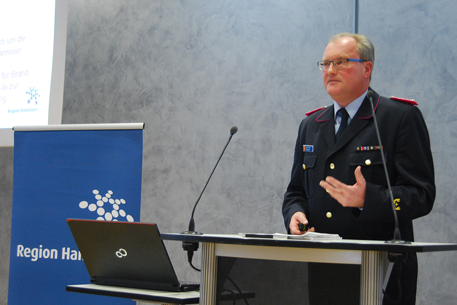 Regionsbrandmeister Karl-Heinz Mensing konnte am vergangenen Sonnabend, 19. November 2016, bei der großen Dienstbesprechung 2016 der Regionsfeuerwehr den Führungskräften der Freiwilligen Feuerwehren der Region Hannover und Gästen im Haus der Region in Hannover mit seinem Jahresbericht eindrucksvolle Zahlen vorlegen. 8.830 Einsatzkräfte (+ 165 gegenüber dem Vorjahr) stellen in 206 Ortsfeuerwehren den Brandschutz für 627.818 Einwohner der Region sicher. Und das rund um die Uhr an 365 Tagen im Jahr. Auf 71 Einwohner kommt damit ein Feuerwehrmann beziehungsweise eine Feuerwehrfrau. Bei 6.339 Einsätzen, von denen 56 Prozent technische Hilfeleistungen waren, sind dies durchschnittlich 17 Einsätze am Tag. Um diesen Standard zu halten, appellierte Mensing an die Politik, sich weiter um die Akzeptanz für Freistellungen bei den Arbeitgebern zu bemühen. Um dem demografischen Wandel zu begegnen, der sich bei den Freiwilligen Feuerwehren der Region im hohen Anteil der 30- bis 50-Jährigen zeige, stehe die Nachwuchs- und Mitgliedergewinnung trotz (noch) stabiler Zahlen bei den Einsatzkräften weiter im Fokus. Unterstützt werden sie durch die niedersächsische Imagekampagne "Sag Ja zur Feuerwehr!", die Mensing ausdrücklich lobte.