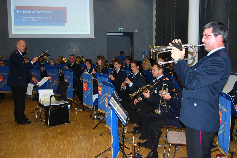 Feierlich beschlossen wurde die Tagung mit dem gemeinsamen Singen der Deutschen Nationalhymne, begleitet vom Blasorchester des Feuerwehrverbandes Region Hannover e.V. unter der Leitung von Hauptstabführer Dieter Hoffmann aus Springe, der die Veranstaltung musikalisch umrahmt hatte. Karl-Heinz Mensing bedankte sich nicht nur bei den Musikerinnen und Musikern, sondern auch bei der Ortsfeuerwehr Landringhausen für die Versorgung mit Getränken und einem kleinen Imbiss sowie der Region Hannover für die Räumlichkeiten und die organisatorische Unterstützung.