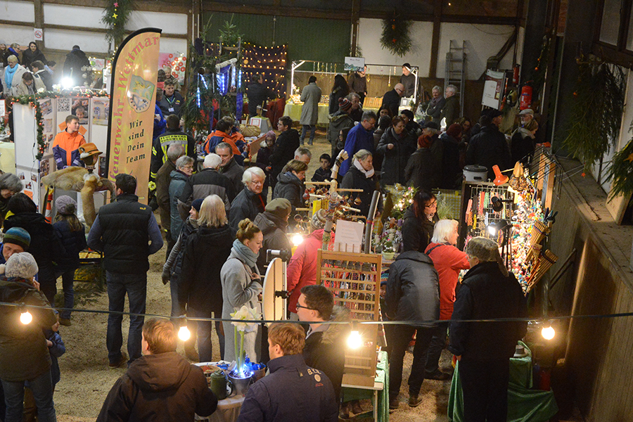 Da sich für den Aufbau der Holzhütten in den vergangenen Jahren nicht mehr genügend Helfer organisieren ließen, konnte mit der Holzhalle der Firma Fortmüller ein Domizil gefunden werden, in dem heute 24 Stände Platz fanden waren. Darunter auch 6 Infostände der örtlichen Vereine, die aber auch im Außenbereich zahlreich vertreten waren. So hatte der TSV Wettmar den Bratwurststand besetzt, der Schützenverein war für die Getränke zuständig, beim Heimatverein gab es Kartoffelpuffer und beim Förderverein der Grundschule leckere Waffeln. Im angrenzenden Gemeindehaus hatte zudem die AWO die Kaffee und Kuchentafel gedeckt. Für den passenden musikalischen Rahmen zur Adventszeit sorgten der gemischte Chor sowie der Feuerwehrmusikzug.