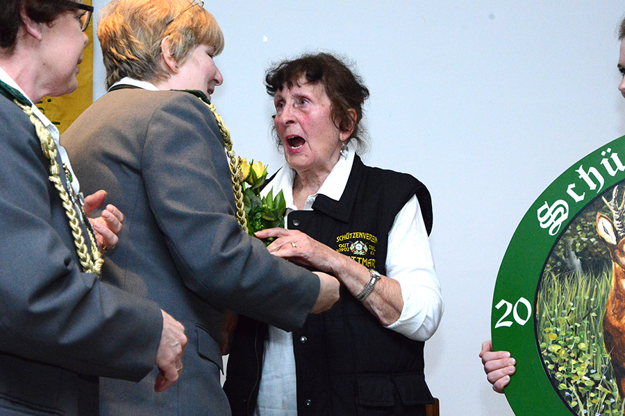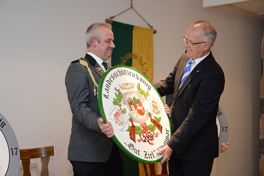Dieser hatte – wie 24 weitere – um die Volksscheibe geschossen. Dass er ein gutes Ergebnis am Dienstag geschossen hatte, hatte sich herumgesprochen, ob es reichte, wusste niemand. Bei der Bekanntgabe der Ergebnisse, vom letzten zum ersten Platz, war der erste Name dann schon Fredermann. Seine Ehefrau Karin hatte den 25. Platz belegt. Als die Platzierungen dann einstellig wurden, stieg die Spannung. Als Rainer Fredermann auch bei Platz 2, den Udo Maurer mit einem 104,1 Teiler belegte, nicht aufgerufen wurde, stand fest: Der Landtagsabgeordnete darf sich die Volksscheibe ans Haus hängen. Er nahm diese von Ortsbürgermeister Erwin Fette in Empfang.