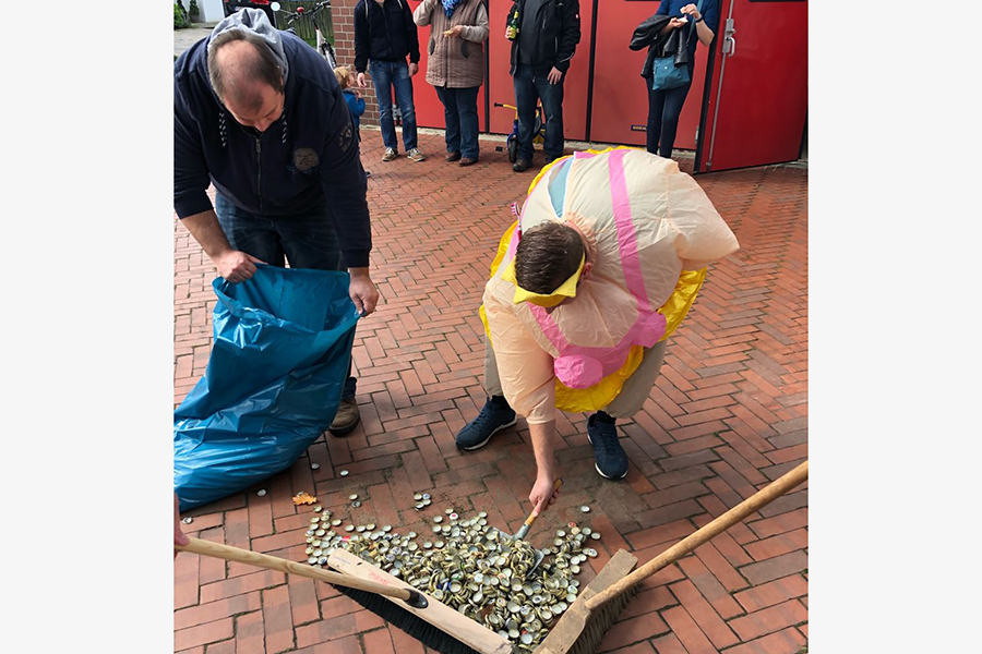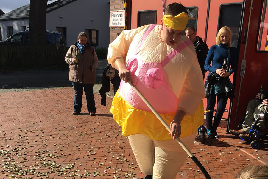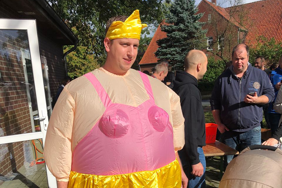 Eine große Menschentraube am Kleinburgwedeler Feuerwehrhaus hat heute für Aufsehen gesorgt. Und nicht nur das: Auch Johannes Mente, der am heutigen Sonntag, 8 Oktober 2017, seinen 30. Geburtstag beging, zog in seinem Kostüm die Blicke auf sich. Denn er musste, wie es die Tradition verlangt, als Junggeselle an seinem 30. Geburtstag fegen. Nicht die Rathaustreppe, dafür aber den Hof der Ortswehr, den bei seinem Eintreffen eine "30" aus Kronkorken zierte. Rund 100 Zuschauer hatten sich eingefunden, der Arbeit des angehenden Feuerwehrmanns zuzusehen: Er hatte erst im vergangenen September erfolgreich den ersten Teil der Truppmannausbildung bestanden, so dass es kein Wunder war, dass auch viele Einsatzkräfte der Ortswehr zugegen waren. Perfekt organisiert von Freunden und Feuerwehrkameraden wurde zudem nebenbei gegrillt und Getränke angeboten. Von Zahnbürste über Handbesen bis zum präparierten Besen wechselten so für den Junggesellen die Werkzeuge zum Fegen, bis auch er erlöst wurde – von der Tochter des stellvertretenden Ortsbrandmeisters.