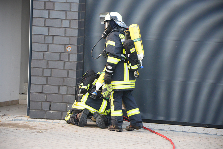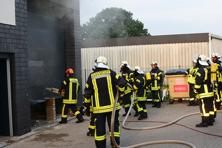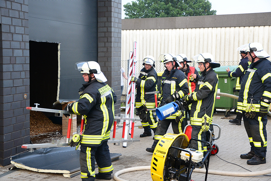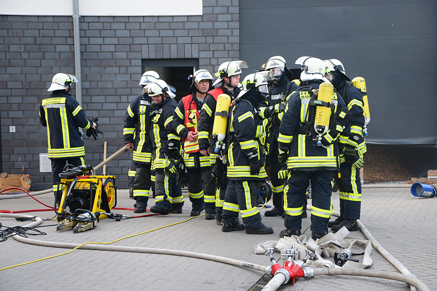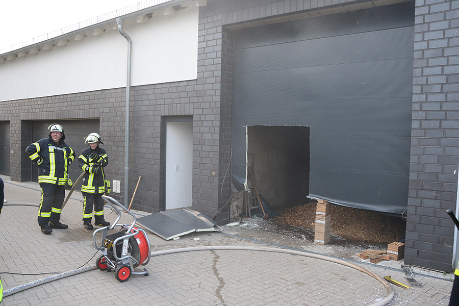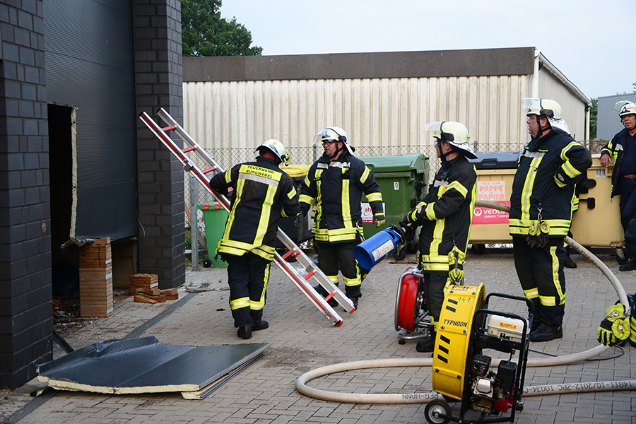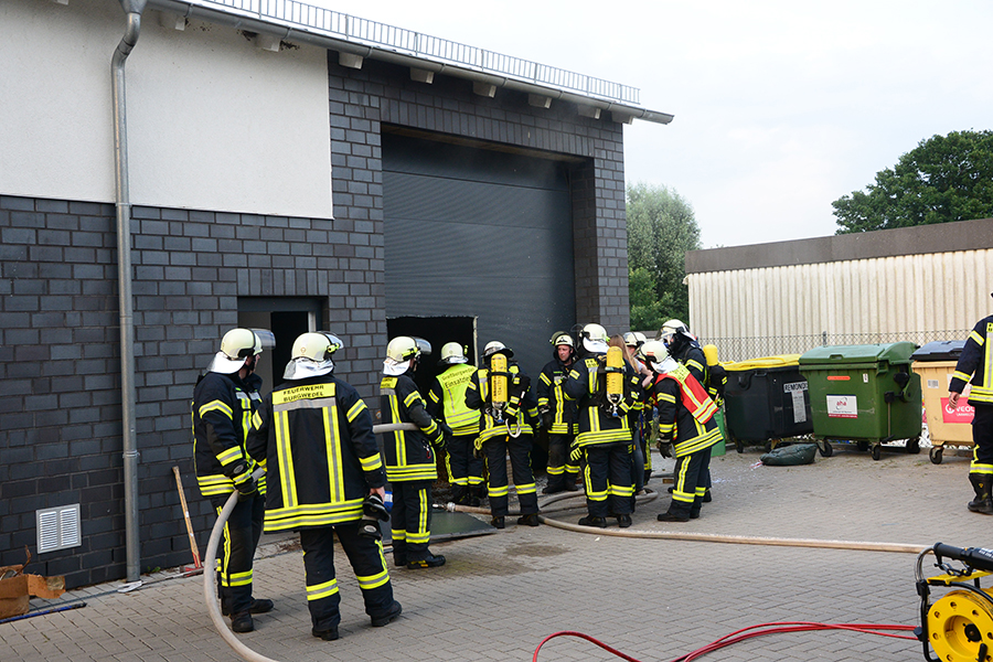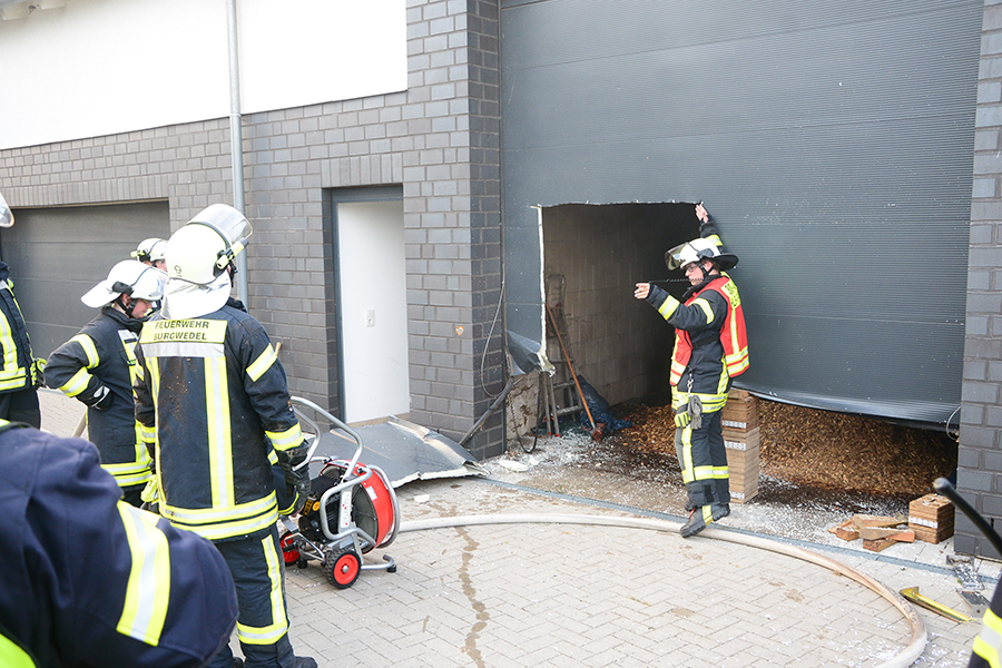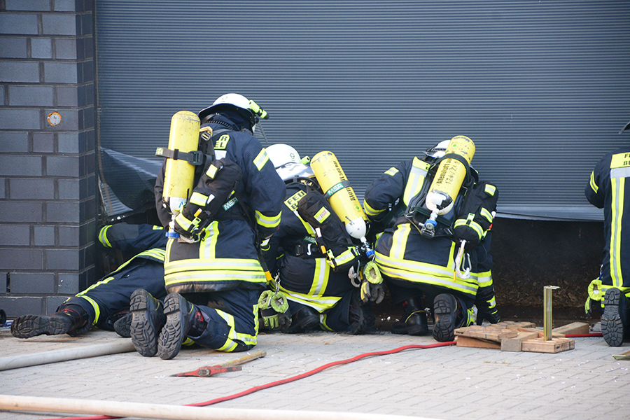 "Erst wollte ich genügend Einsatzkräfte vor Ort haben, ehe wir das Rolltor öffnen", beschreibt Einsatzleiter Carsten Rüdiger seine Vorgehensweise. Denn es sei durchaus mit einer Durchzündung der Rauchgase zu rechnen gewesen, sobald die Außenluft in das Gebäude dringen kann.