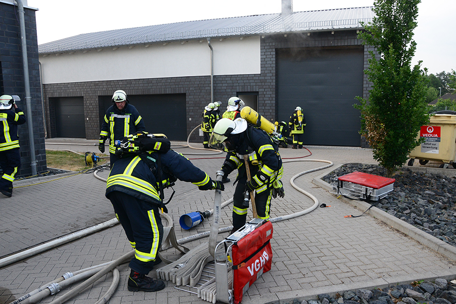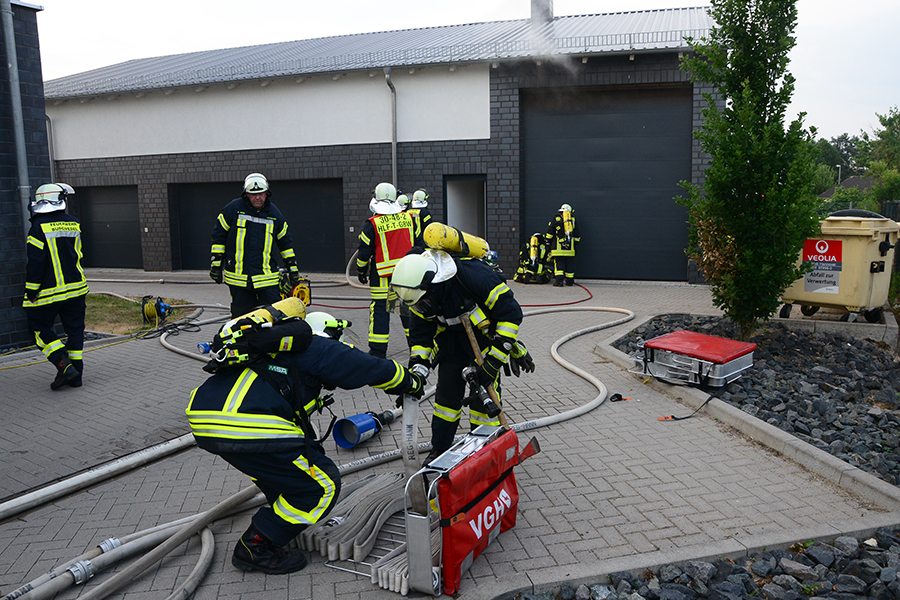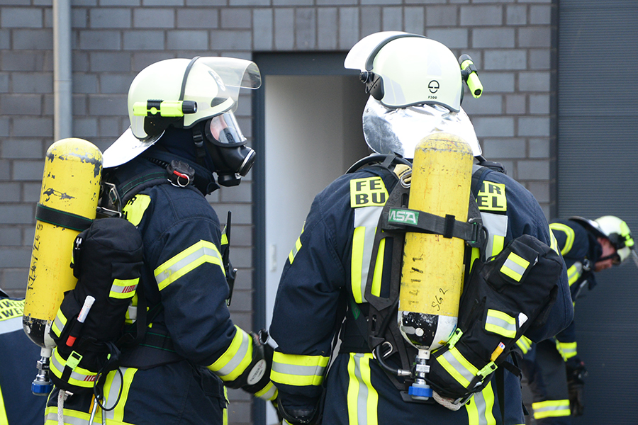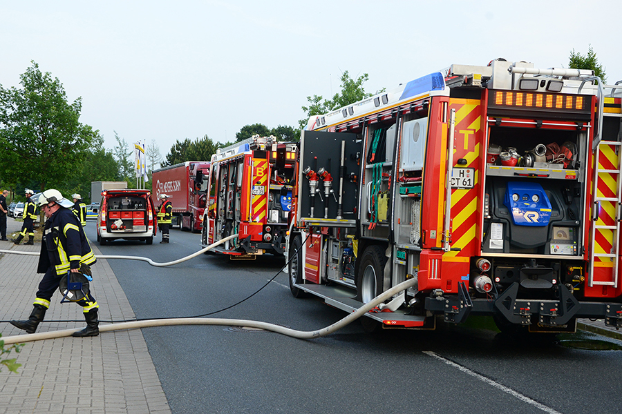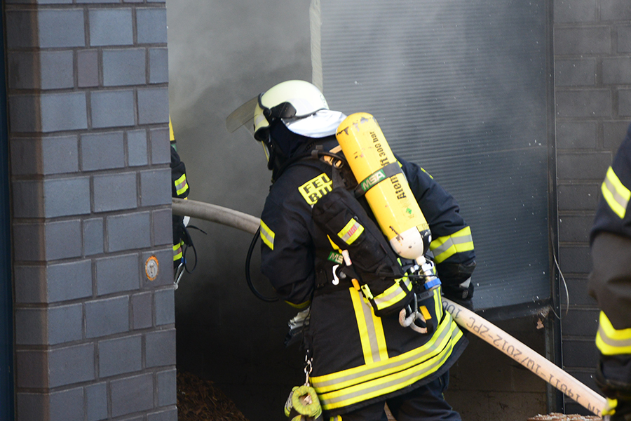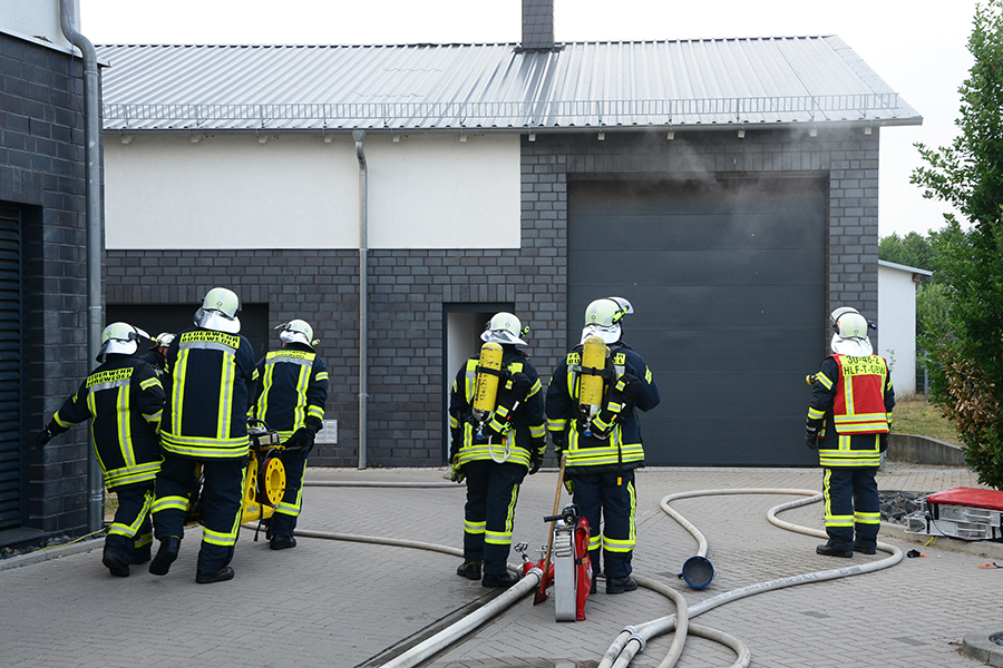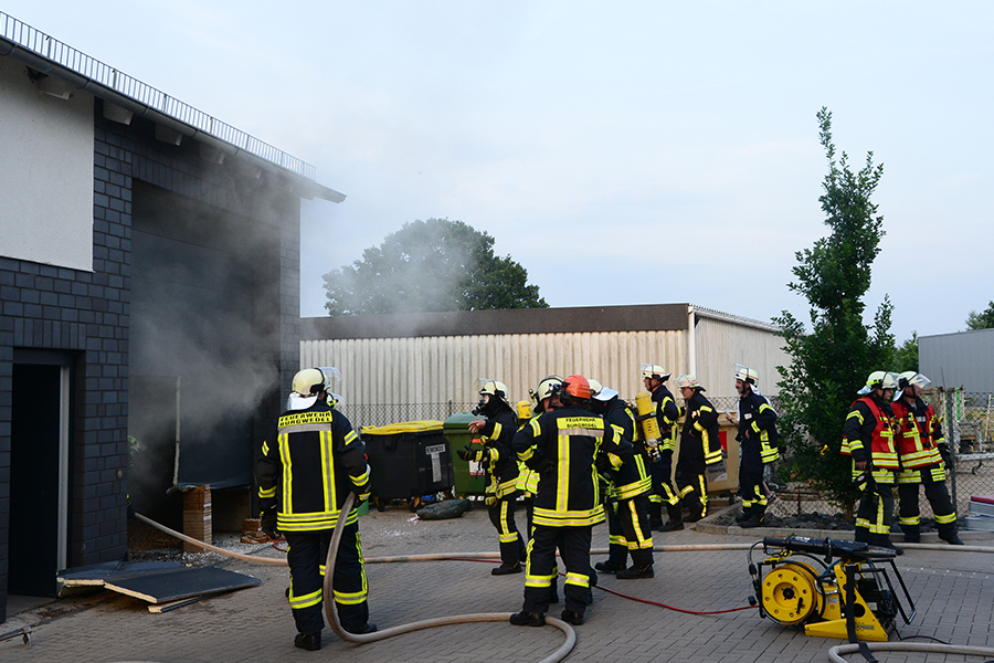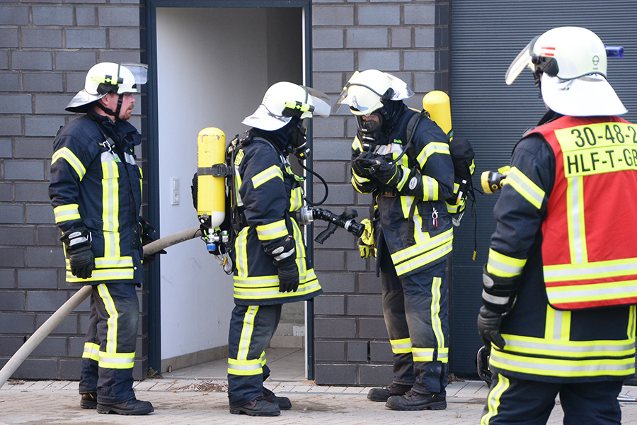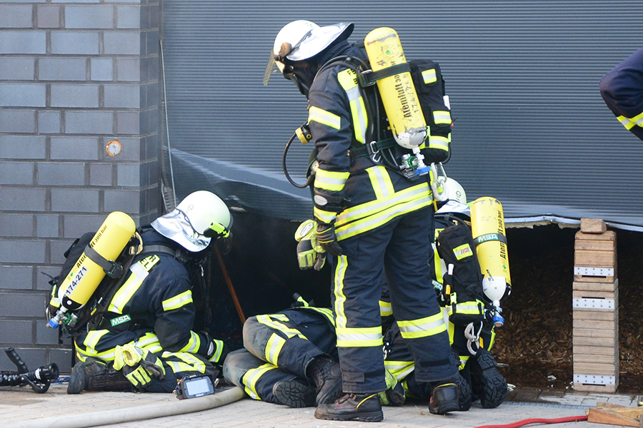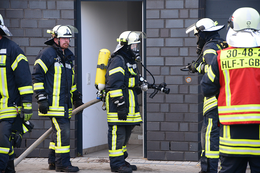 "Erst wollte ich genügend Einsatzkräfte vor Ort haben, ehe wir das Rolltor öffnen", beschreibt Einsatzleiter Carsten Rüdiger seine Vorgehensweise. Denn es sei durchaus mit einer Durchzündung der Rauchgase zu rechnen gewesen, sobald die Außenluft in das Gebäude dringen kann.