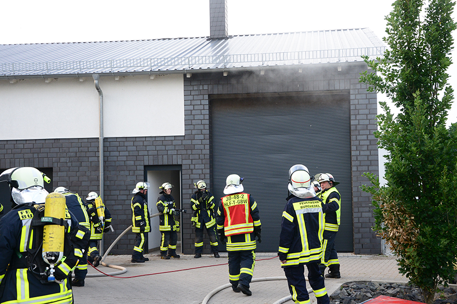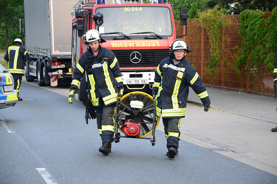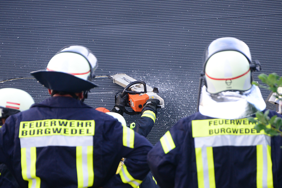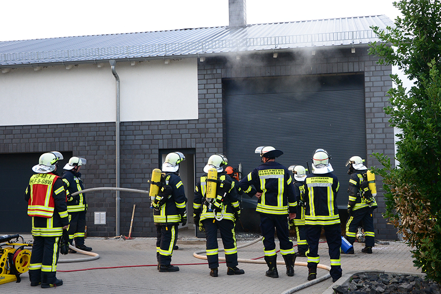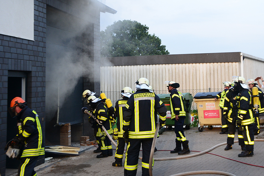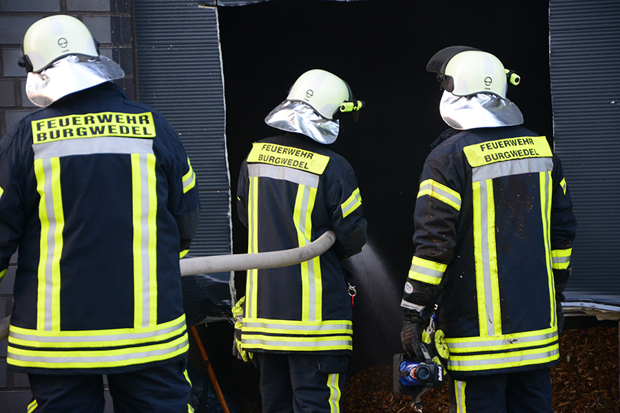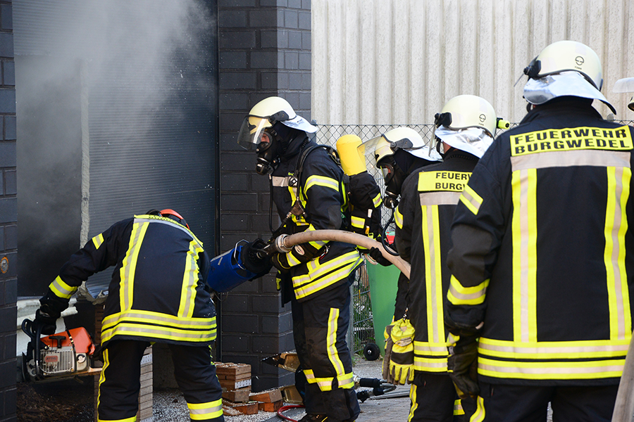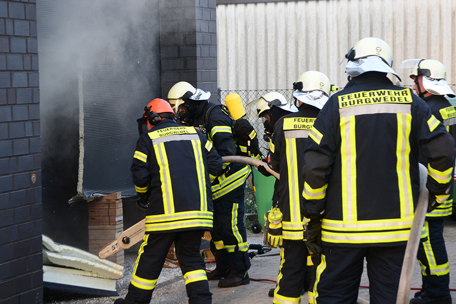 Einsatzleiter und Ortsbrandmeister Carsten Rüdiger stellte bei seiner Erkundung eine starke Rauchentwicklung aus einem Rolltor fest und ließ sofort zwei B-Schläuche verlegen sowie eine Wasserversorgung aufbauen. Zudem erhöhte er die Alarmstufe und forderte die Ortsfeuerwehr Kleinburgwedel sowie die Drehleiter aus Langenhagen zur Unterstützung an.