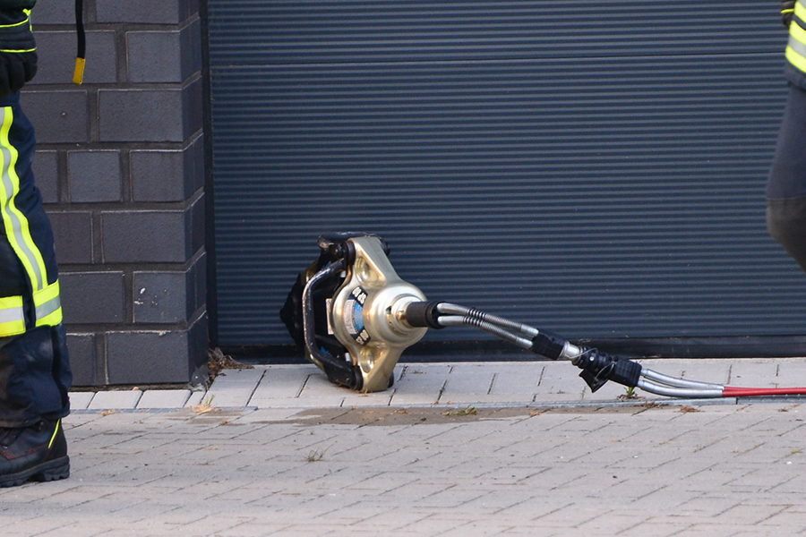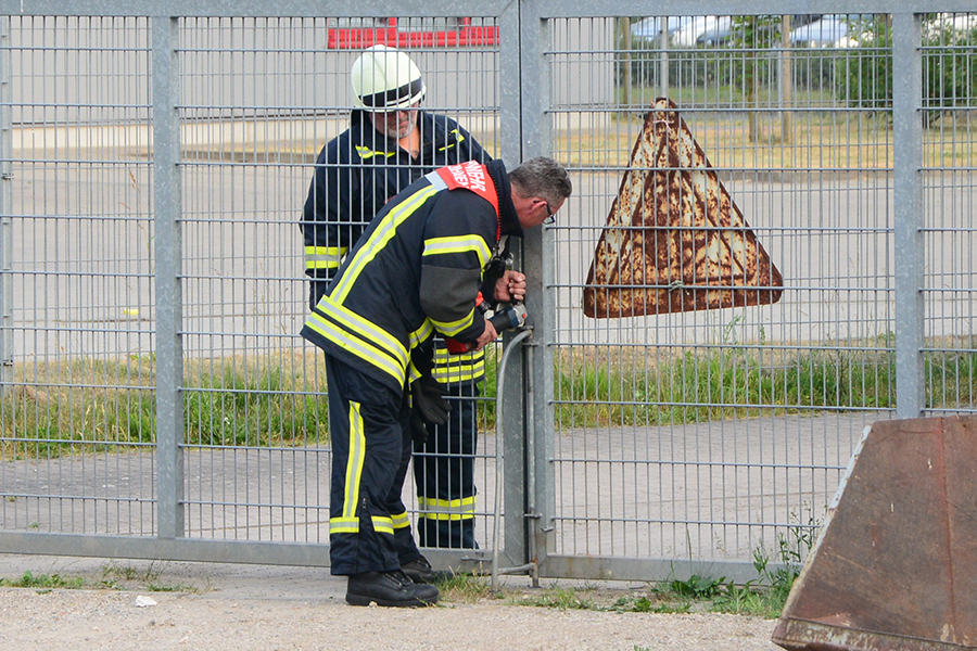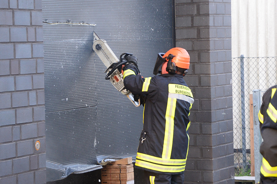 Drei Trupps unter Atemschutz gingen mit zwei C-Schläuchen und einem Schaumrohr vor dem Gebäude in Stellung. Mit dem hydraulischen Spreizer wurde anschließend das Tor zunächst ein wenig angehoben, da sich dieses elektrisch nicht mehr öffnen ließ. Durch einen Spalt konnte das Feuer in einem Bereich des dahinter liegenden Raumes ausfindig gemacht werden. Mit einer Kettensäge wurde ein Teil des Tores entfernt und der Löschangriff mit dem Schaurohr begonnen.