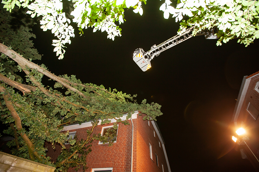 Nicht einfacher war die Lage durch, dass der Ast nicht komplett vom Baum abgetrennt war und die tonnenschwere Last nun auf verschiedenen Punkten lastete. Zur Unterstützung wurde die Drehleiter der Freiwilligen Feuerwehr Altwarmbüchen alarmiert, zudem konnte von der Großburgwedeler Firma Languth-Erdbau ein Kran organisiert werden, um den Ast zunächst zu fixieren und anschließend Stück für Stück abzutragen. Es dauerte bis 5 Uhr, bis der Ast entfernt war und die Einsatzkräfte wieder einrücken konnten.
