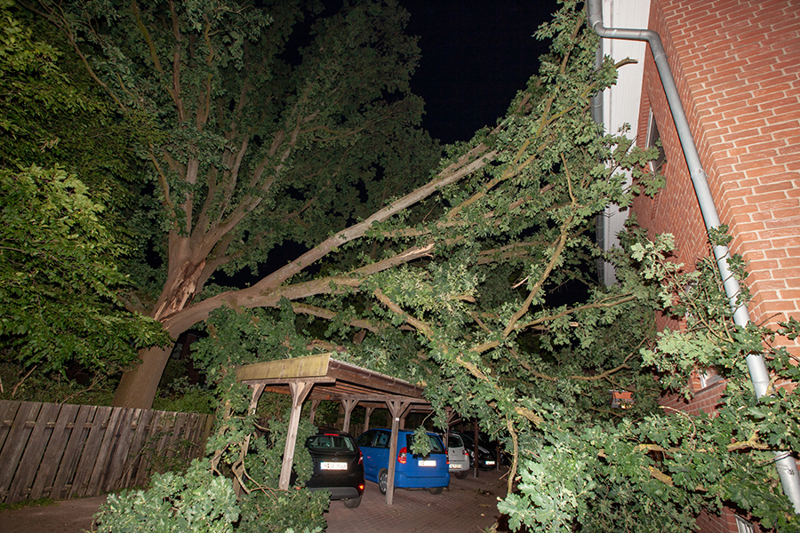 An Carport wie auch dem Dach des Hauses kam es augenscheinlich zu Schäden, die innenliegenden Wohnungen des Hauses waren nicht betroffen. Ein Baumsachverständiger hat nun zu klären, ob eventuell der gesamte Baum gefällt werden muss, da durch den abgebrochenen Ast ein Teil des Stammes beschädigt worden ist.