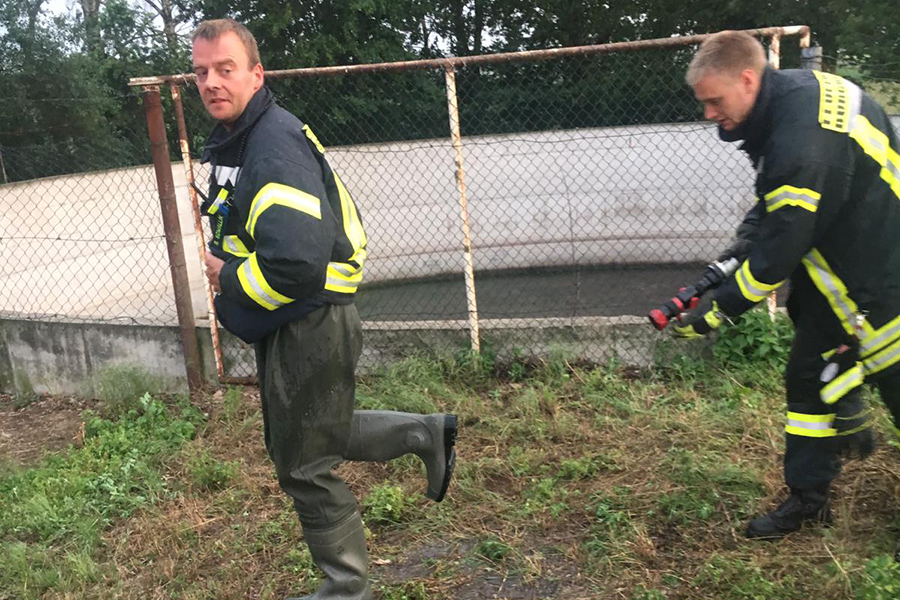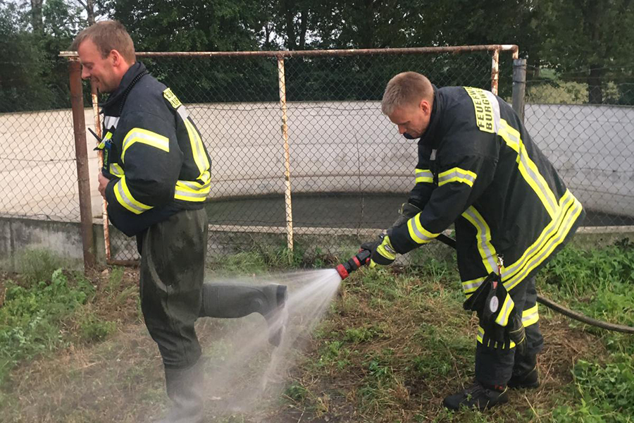 "Da wir so einen Einsatz schon einmal hatten, haben wir auf unserem Fahrzeug Wathosen und Käscher verlastet", so Ortsbrandmeister Ingmar Franke, der den Einsatz auch leitete. Es wurde noch schnell eine Transportbox geholt und anschließend stiegen zwei Einsatzkräfte in den Güllebehälter. Dort retteten sie die total entkräfteten Bussarde aus ihrer Lage.