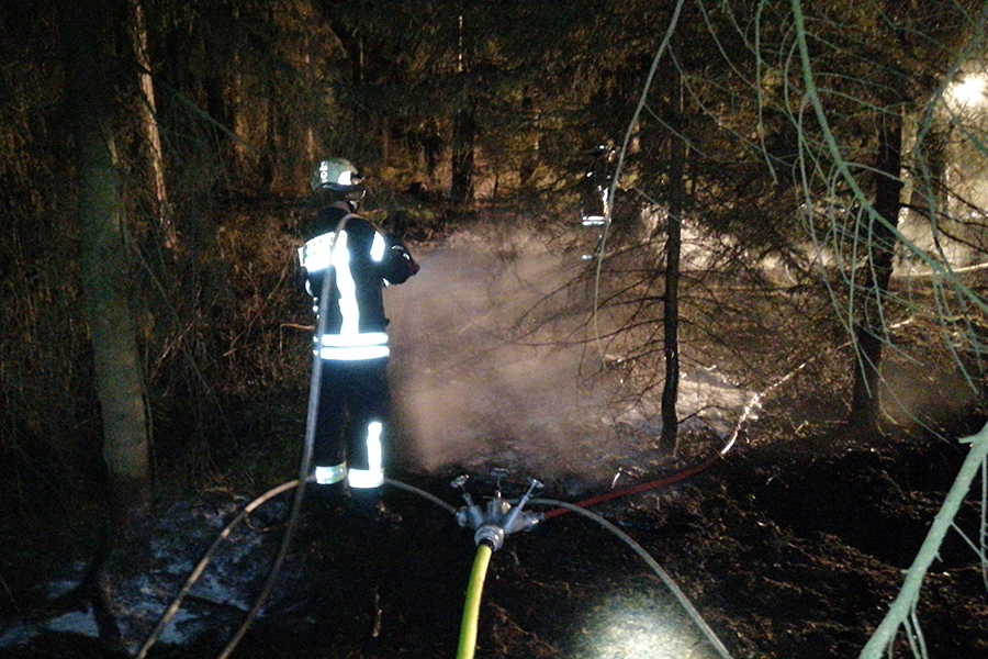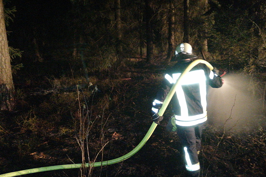 Nach intensiver Suche wurde das Feuer gefunden. Es brannte der Waldbewuchs mit üblicher Bodenvegetation. Im Bereich der Bodenvegetation hatte sich das Feuer auf einer Fläche von etwa 50×50 Meter sehr langsam ausgebreitet. "Begünstigt hat diesen Brandverlauf der noch gut angefeuchtete und begrünte Bodenbewuchs sowie die vorherrschende Windstille im Schadensareal", so die Feuerwehr.