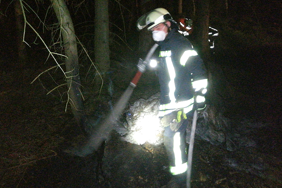 Unter großzügigem Wassereinsatz konnten die Glutnester, die sich überwiegend im Bereich der Baumwurzeln auf Grund des massiveren Brandgutes ausfindig machen ließen, soweit herunterkühlen und löschen, dass ein Ausbreiten und Weiterbrennen des Feuers verhindert wurde.