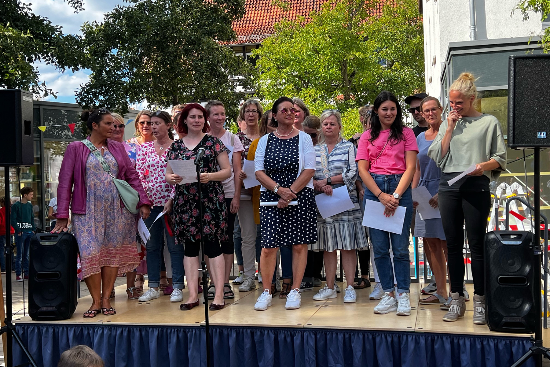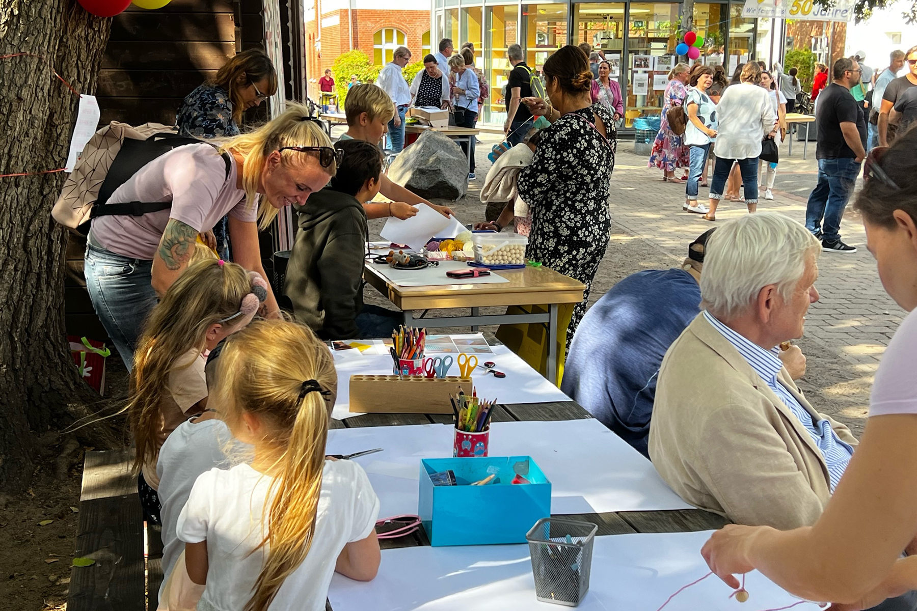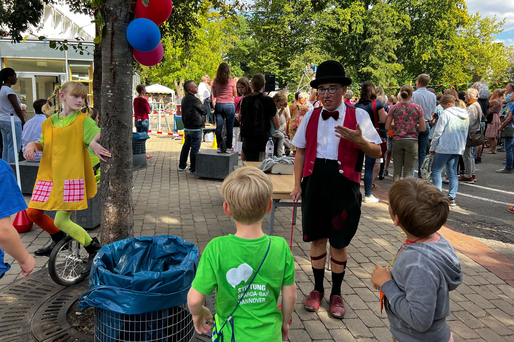 Auf dem Schulgelände kamen am vergangenen Freitagnachmittag, 2. September 2022, zahlreiche Gäste zusammen, um bei strahlendem Sonnenschein ein Fest zu feiern. Viele Stände und Spielstationen sorgten für Mitmachaktionen und ließen keine Langeweile aufkommen. Für das leibliche Wohl war mit Bratwurst, Kuchen oder selbtsgemachtem Honig bestens gesorgt. Monsieur Momo sorgte als Walkact mit seinem kleinen Hund, der übrigens nur in seiner Phantasie existierte, für großen Spaß bei den kleinen Gästen.