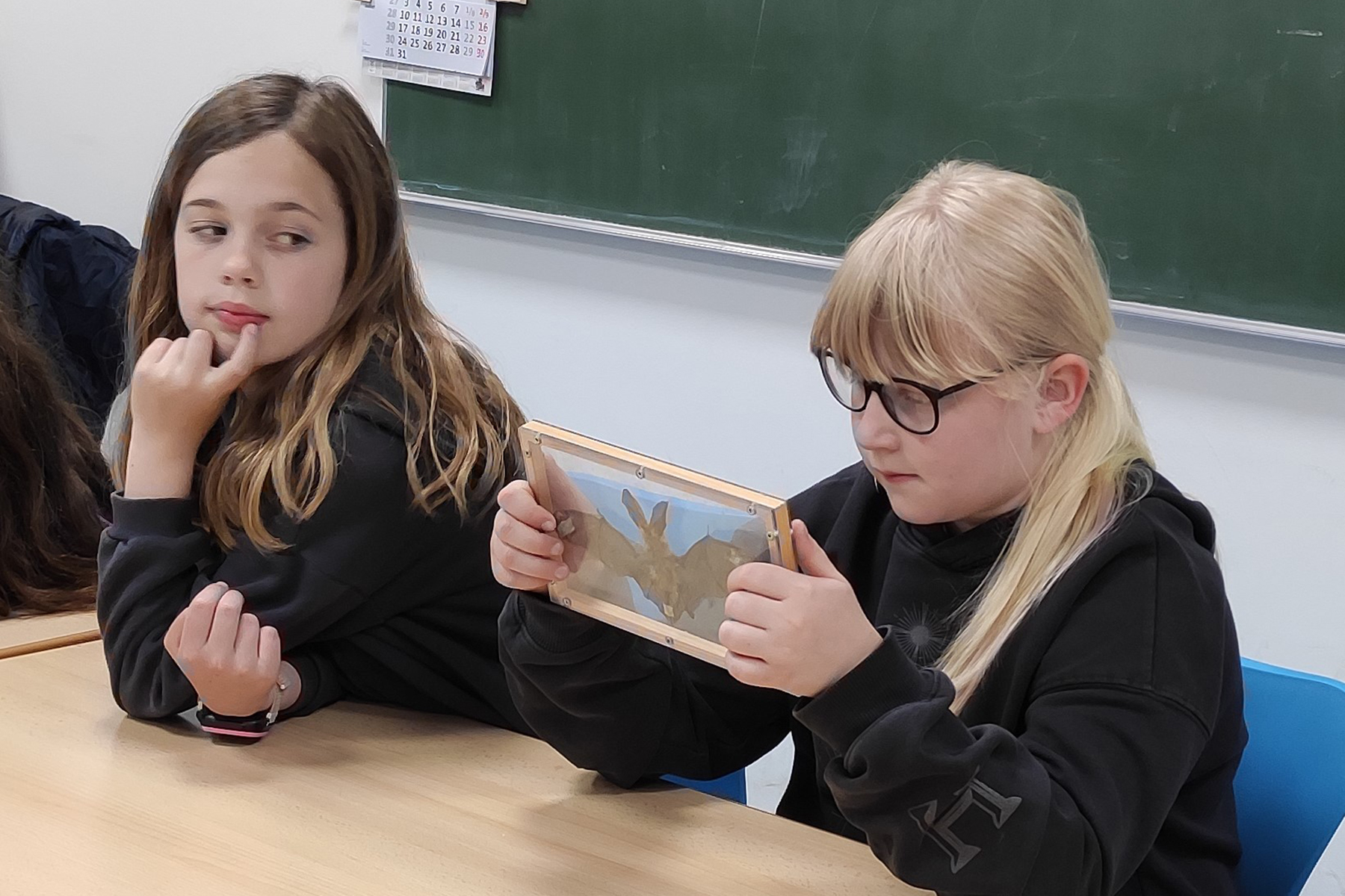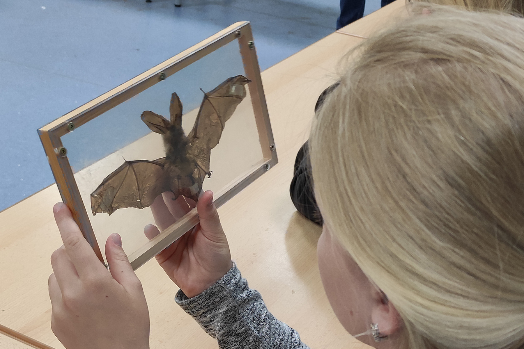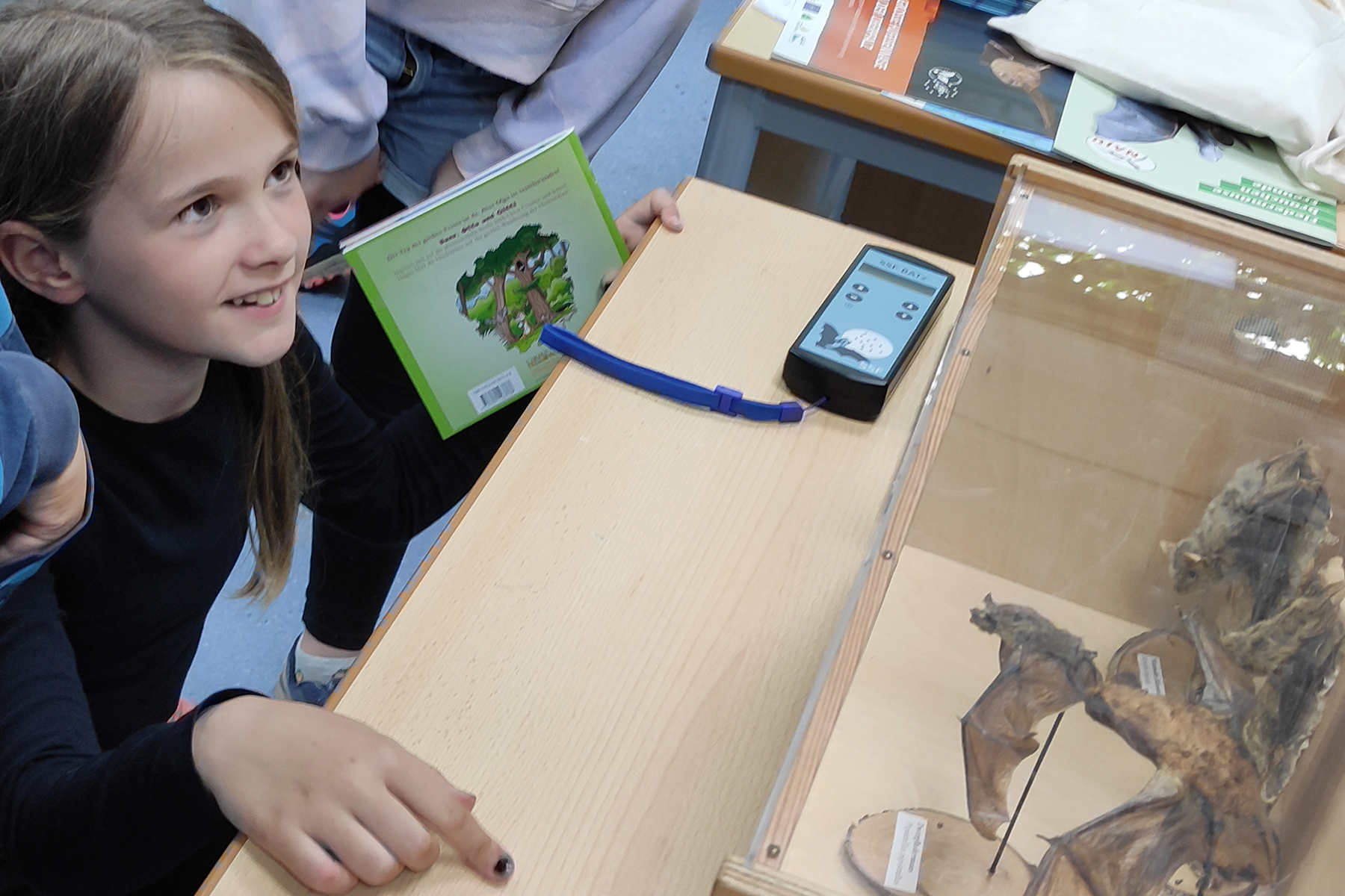 Den Kontakt zu ihr hat die Schule von Michael Krelle, dem Naturschutzbeauftragten der Region Hannover für den Bereich Burgwedel, bekommen. Anne Walter ist für eine Stunde in die Schule gekommen und hatte auch einige Fledermäuse dabei. Allerdings flogen diese nicht durch das Klassenzimmer. Es handelte sich hierbei um Tierpräparate, denen die Kinder sich nähern konnten, ohne dass einer vor dem anderen Angst haben musste. So konnten die Kinder genau erkennen, dass sich die Fledermausflügel aus der Hand des Tieres gebildet haben. Der Oberarm ist stark verkürzt, dafür sind die Finger extrem verlängert. Dazwischen spannt sich eine geschmeidige, gut durchblutete Flughaut wie eine feine Membran, ein zuverlässiges Segel. Die Flügel helfen auch, vorbeifliegende Insekten aus der Luft zu keschern.
