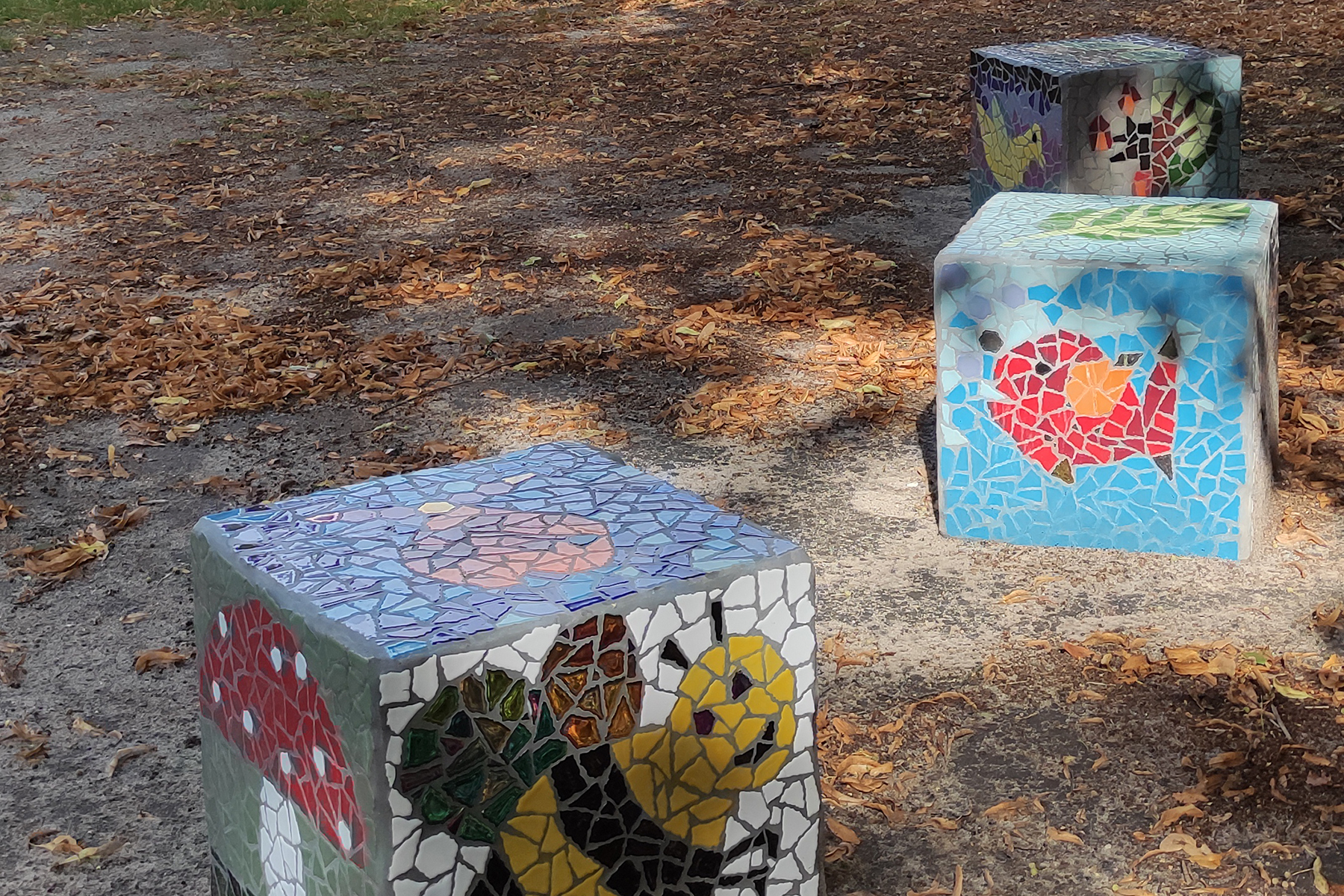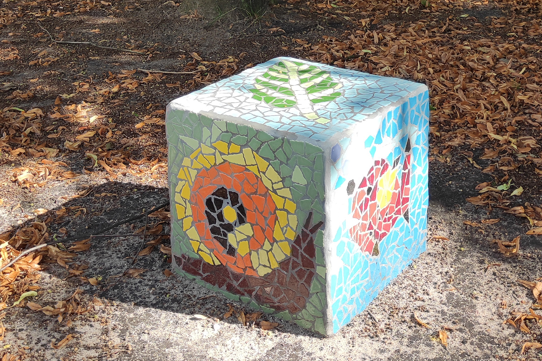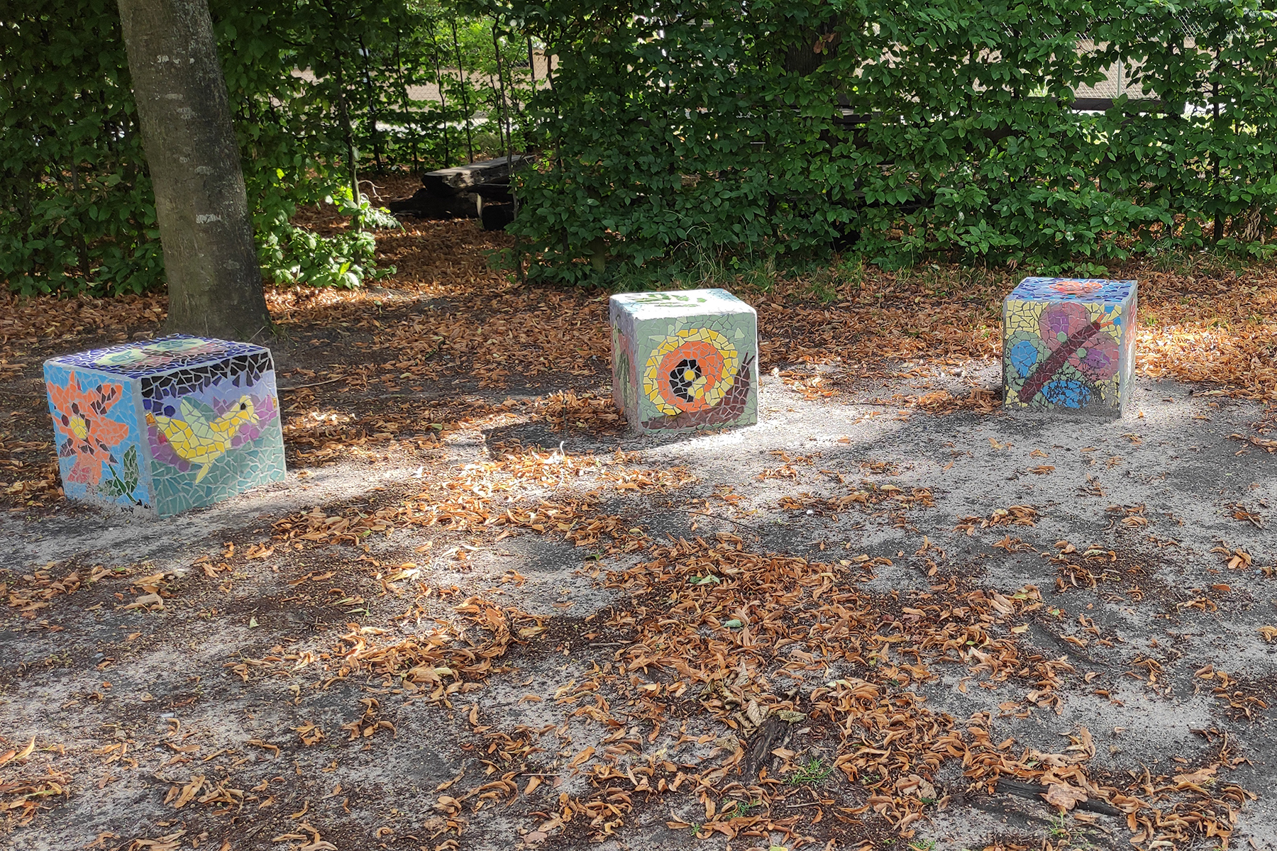 Für jeden Würfel wurden fünf Netze gestaltet. Aus den Resten der Mosaiksteinchen und Netze durften sich die Kinder eigene kleine Bilder herstellen. Angelika Algieri hat die entstandenen Mosaikplatten an die Steinklötze geklebt und anschließend verfugt. Hilfe hat sie dabei von Papas aus den Klassen und Herrn König bekommen.