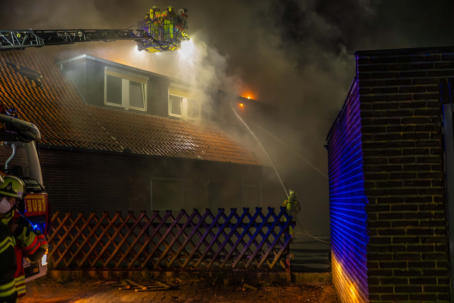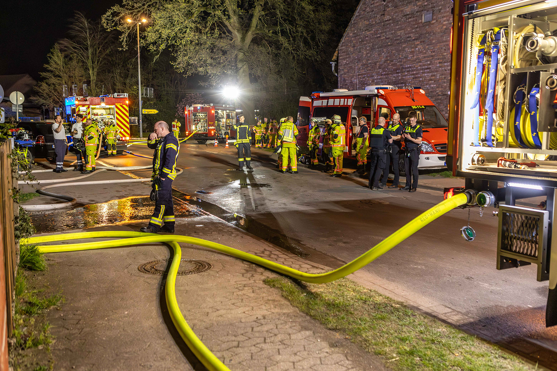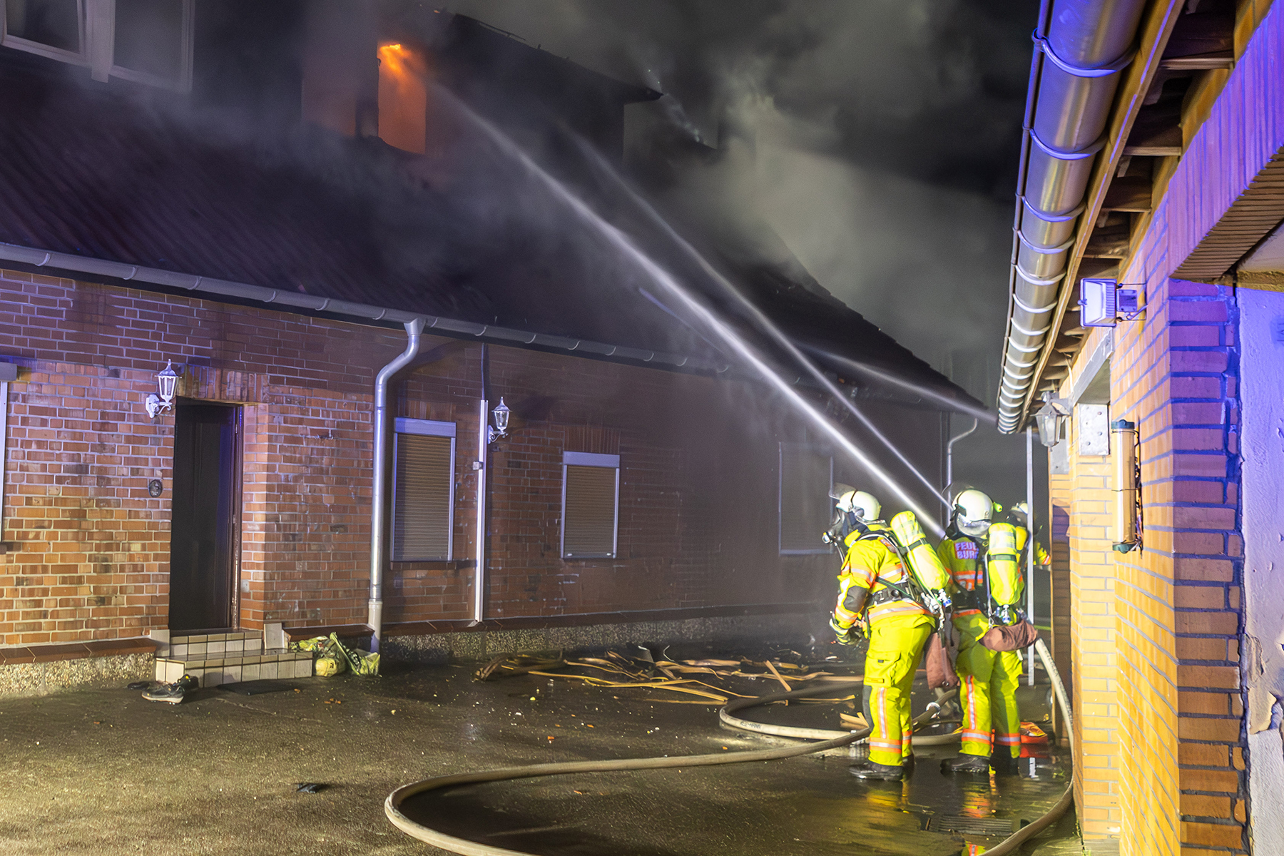 In der Nacht wurde eine Brandwache am Gebäude positioniert, die um 4 Uhr noch einmal einen Löschangriff vornehmen musste. Um 7:30 Uhr wurde dann noch einmal die Drehleiter aus Großburgwedel alarmiert, um erneut einzelne Glutnester von außen zu bekämpfen. Um 9:30 Uhr kam von der Wache in Großburgwedel noch eine Rettungssäge, mit der die Erker auf dem Dach aufgeschnitten wurden.