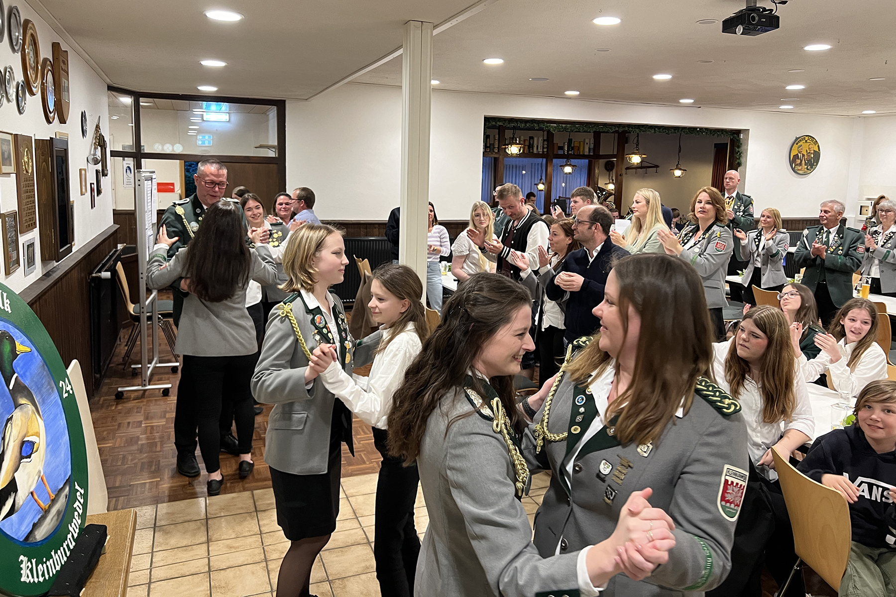 Ob Schützenmitglied, Bürger, Firma oder Verein – es konnten viele Teilnehmer im Vereinsheim an den Schießtagen um das Schützenfest begrüßt werden. Am Sonnabend, 27. April, war gegen 19 Uhr das Schießen beendet und ging um 20 Uhr in die Proklamation, die Bekanntgabe der Gewinner, über. Ortsbürgermeister Lars Wöhler und der 1. Vorsitzende Nick Bienio übernahmen das Wort und lösten all die Spekulationen um die vermuteten Preisträger auf. Denn was wurde da im Vorfeld gefiebert, geschätzt und prognostiziert, wer denn da welchen guten Schuss platziert hatte.