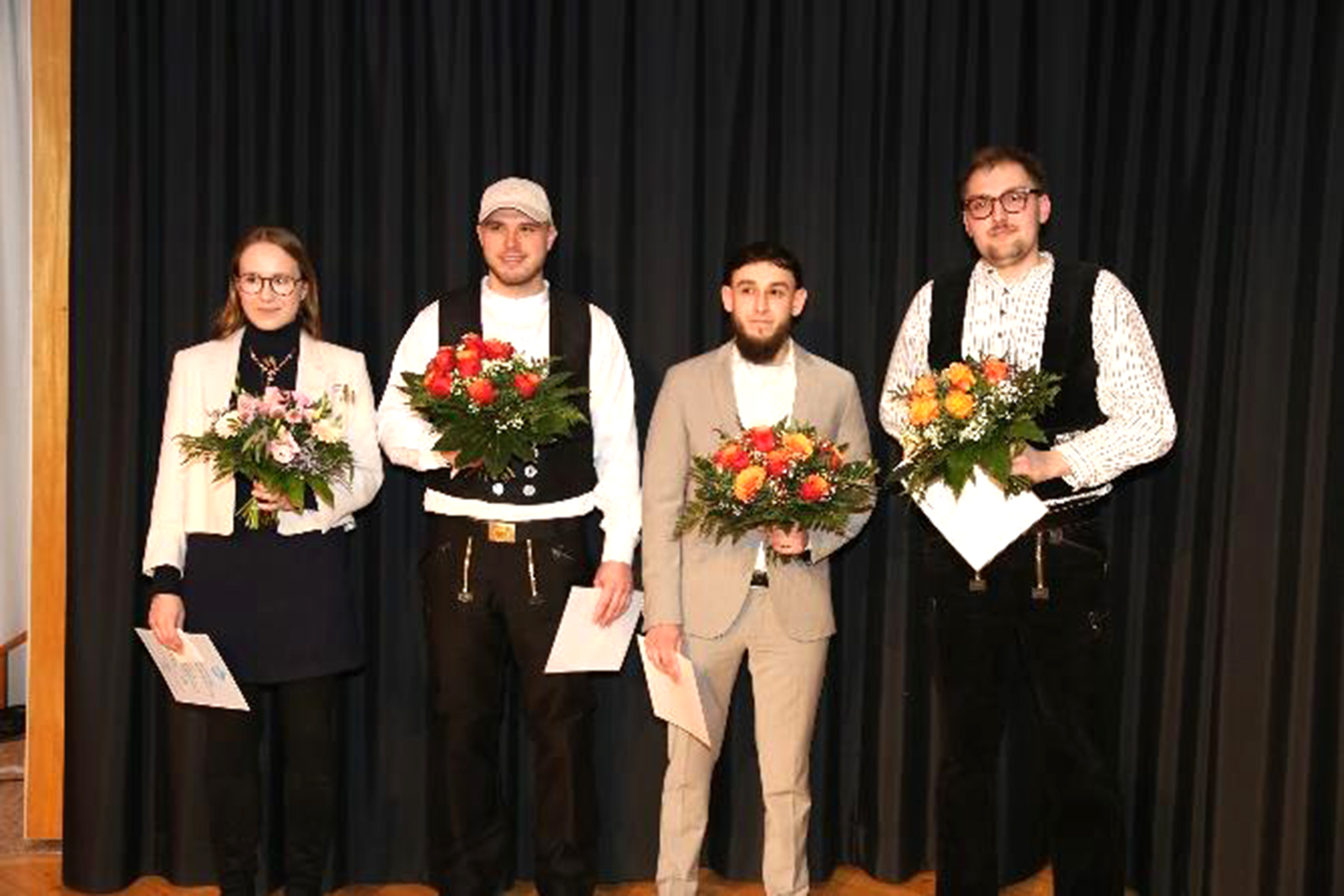 Für besonders herausragende Leistungen wurden eine Junggesellin und drei Junggesellen ausgezeichnet: eine Metallbauerin sowie ein Maler, ein Zimmerer und ein Dachdecker erhielten eine besondere Ehrung für ihre exzellenten Prüfungsergebnisse.