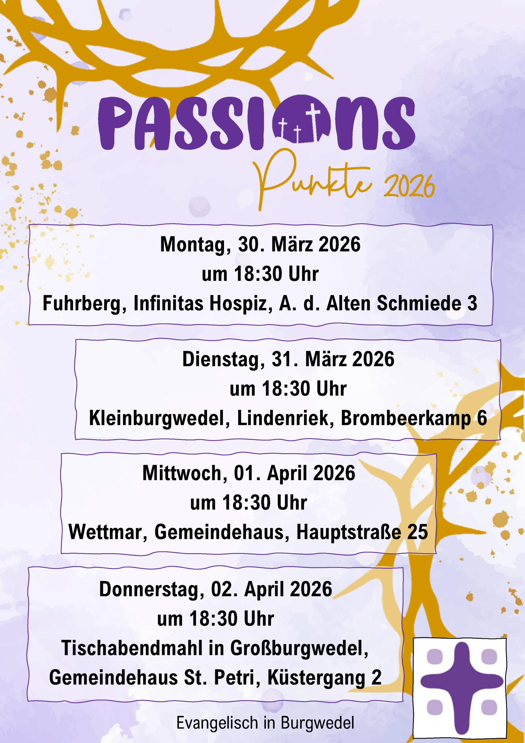 Unter dem Leitwort „Was uns auf der Seele brennt“ laden die evangelischen Kirchengemeinden in Burgwedel in der Karwoche 2026 zu einer besonderen Reihe von Passionsandachten ein. Die „Passionspunkte“ verlassen dabei bewusst die gewohnten Kirchenräume und wenden sich Orten zu, an denen Menschen mit Abschied, Pflege, Zeitdruck und großer Verantwortung konfrontiert sind.