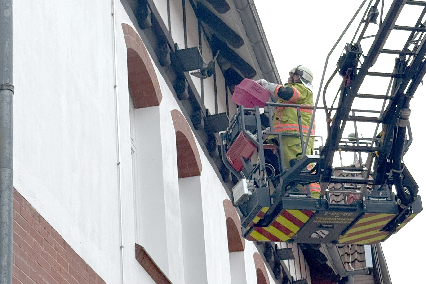 Feuerwehr Großburgwedel rettet Taube vom Fachwerk der Grundschule